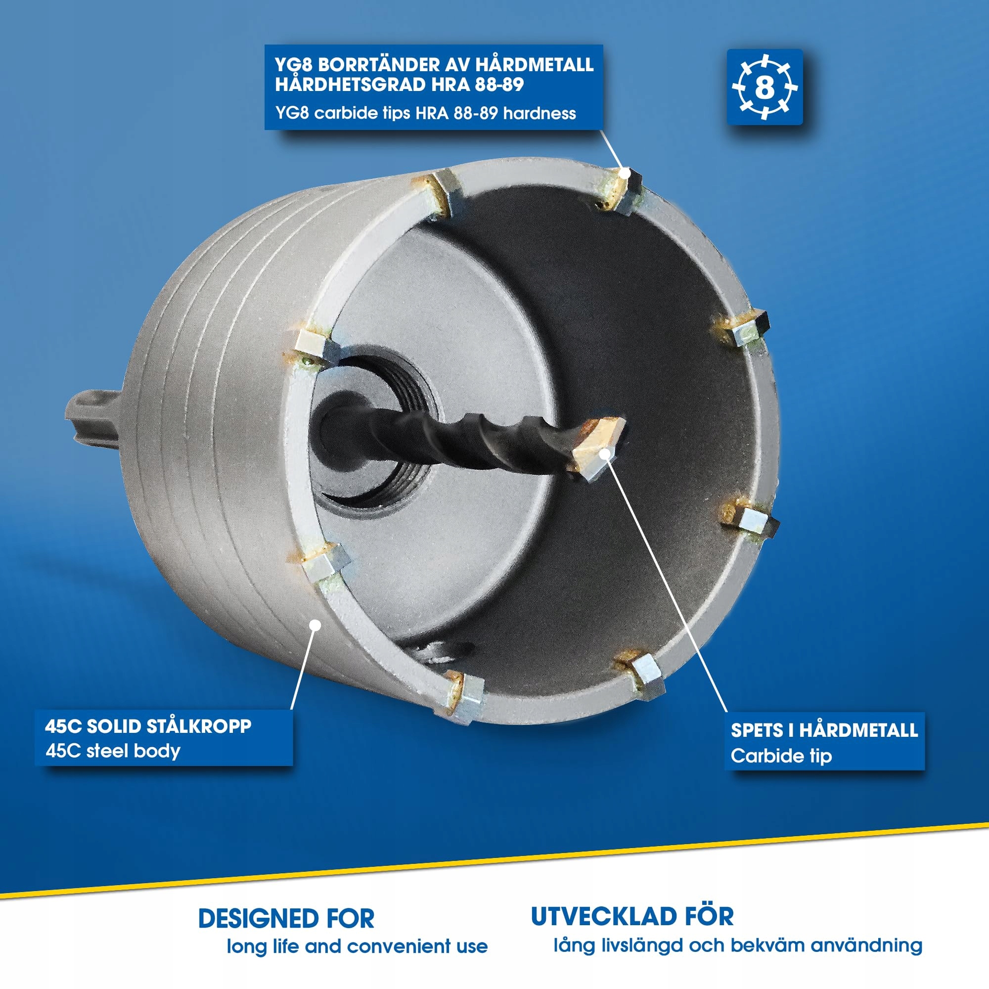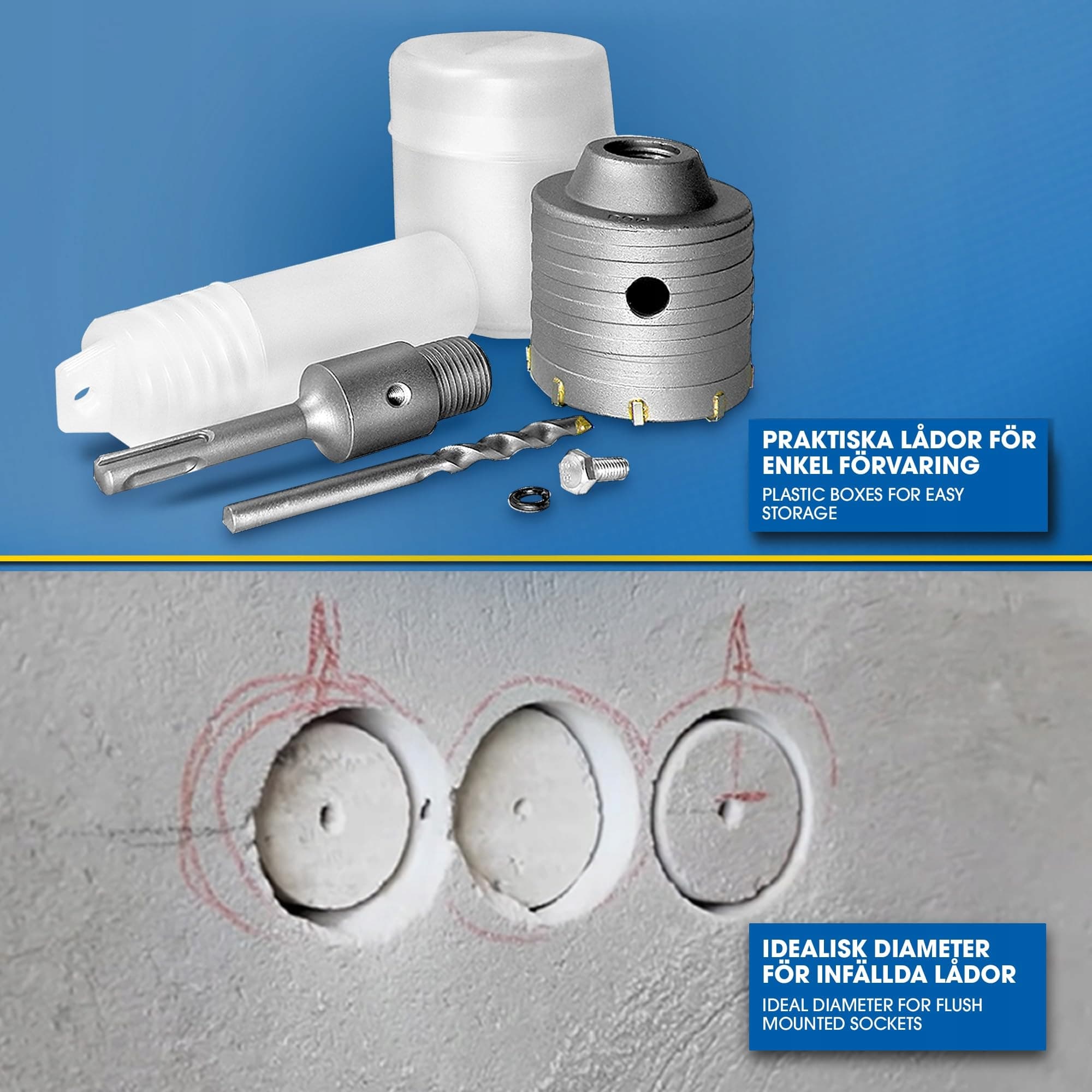 Zestaw wierteł S&R Hohl-Bohrkrone Ø 68mm z adapterem SDS plus 110mm i wiertłem centrującym 8x110mm. Odporne na uderzenia, wiertła do otworów, wiertła do gniazd, do młotów wiertniczych