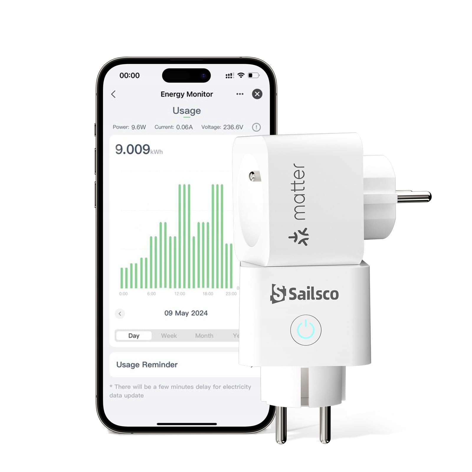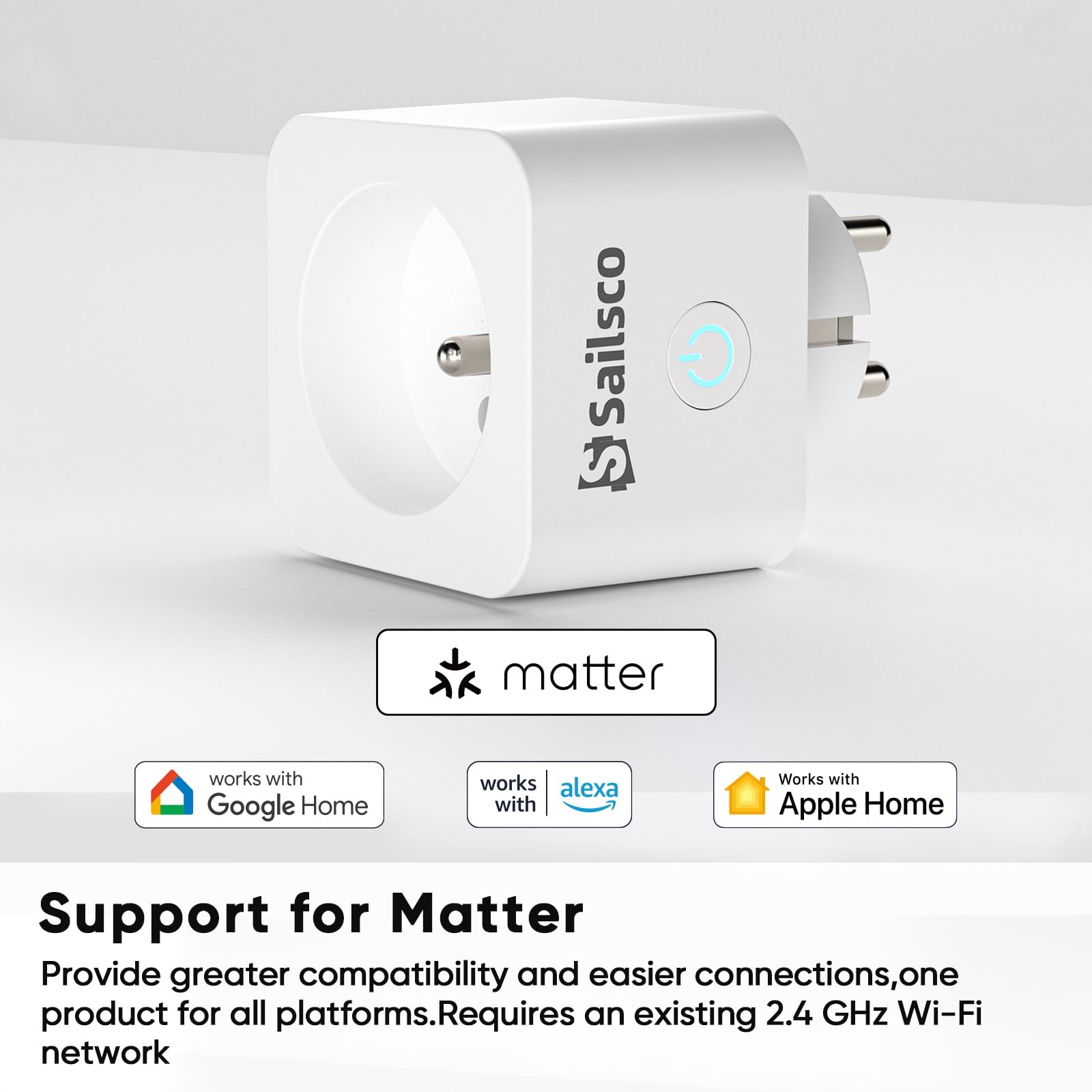 Gniazdko Sailsco Matter Smart z pomiarem zużycia energii, typ E gniazdka WLAN z licznikiem, działa z kontrolą głosową, zdalnym dostępem, Smart Life, Apple HomeKit, Alexa, Google, 16A, 2 sztuki