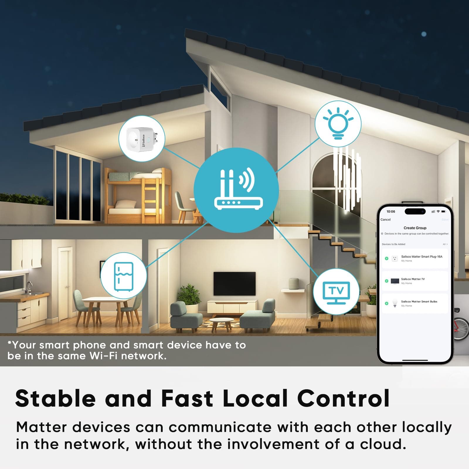 【100% PRYWATNOŚCI & LAN & BRAK CHMURY】 - Ciesz się najwyższą prywatnością z gniazdkiem Sailsco Matter Smart. Brak chmury, brak rejestracji i brak śledzenia danych. Bezpośredni dostęp, brak zależności od chmury. Użyj urządzenia certyfikowanego przez Matter w swojej lokalnej sieci (LAN) i ciesz się stałym dostępem, nawet gdy Twoje internet w domu jest offline