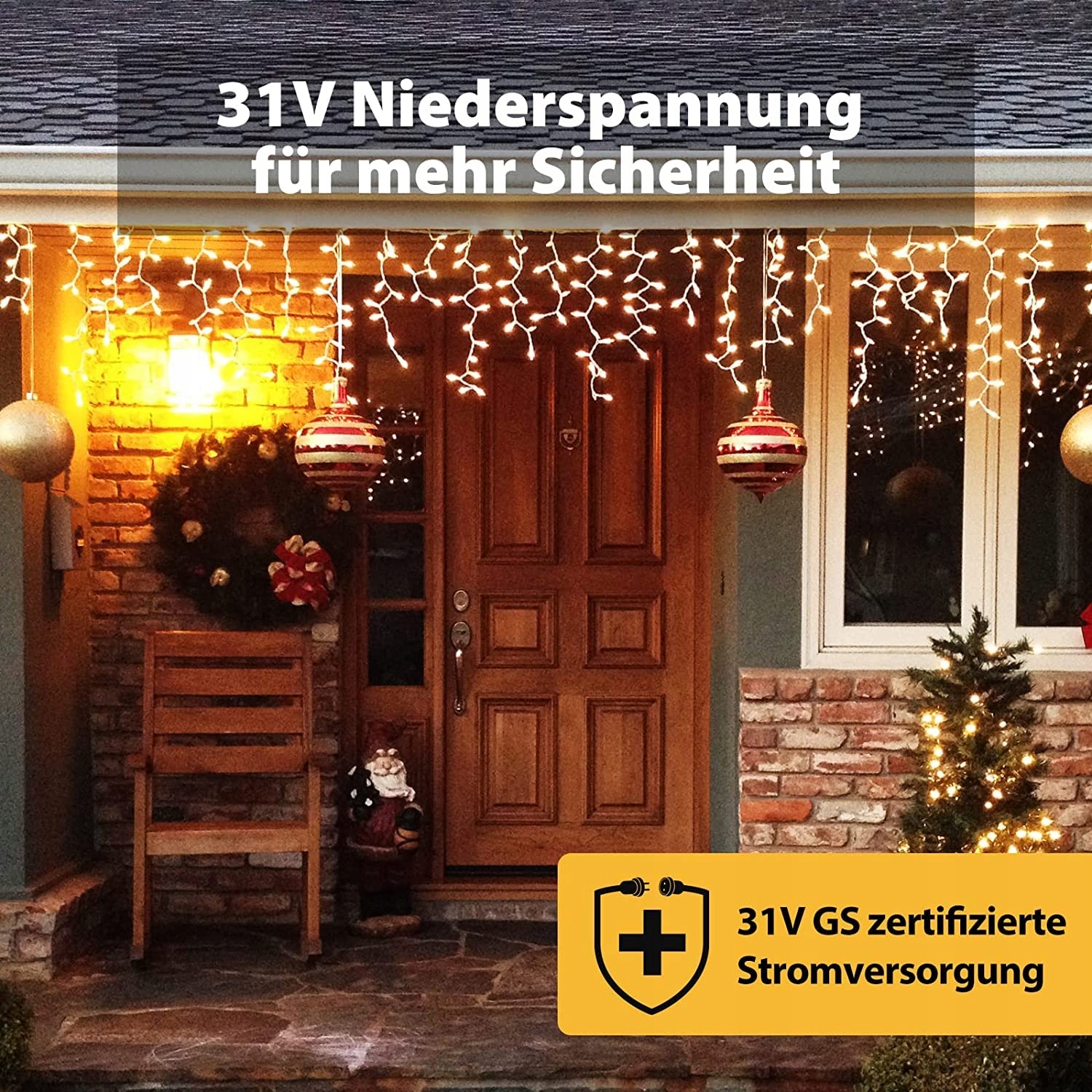 Kurtyna świetlna LED niskonapięciowa: zasilanie certyfikowane GS 31V. 8 trybów, takich jak migotanie (1. kombinacja, 2. fala świetlna, 3. sekwencyjnie, 4. żarzenie, 5. błyskanie, 6. przejścia, 7. iskrzenie, 8. stałe oświetlenie) i funkcja pamięci.