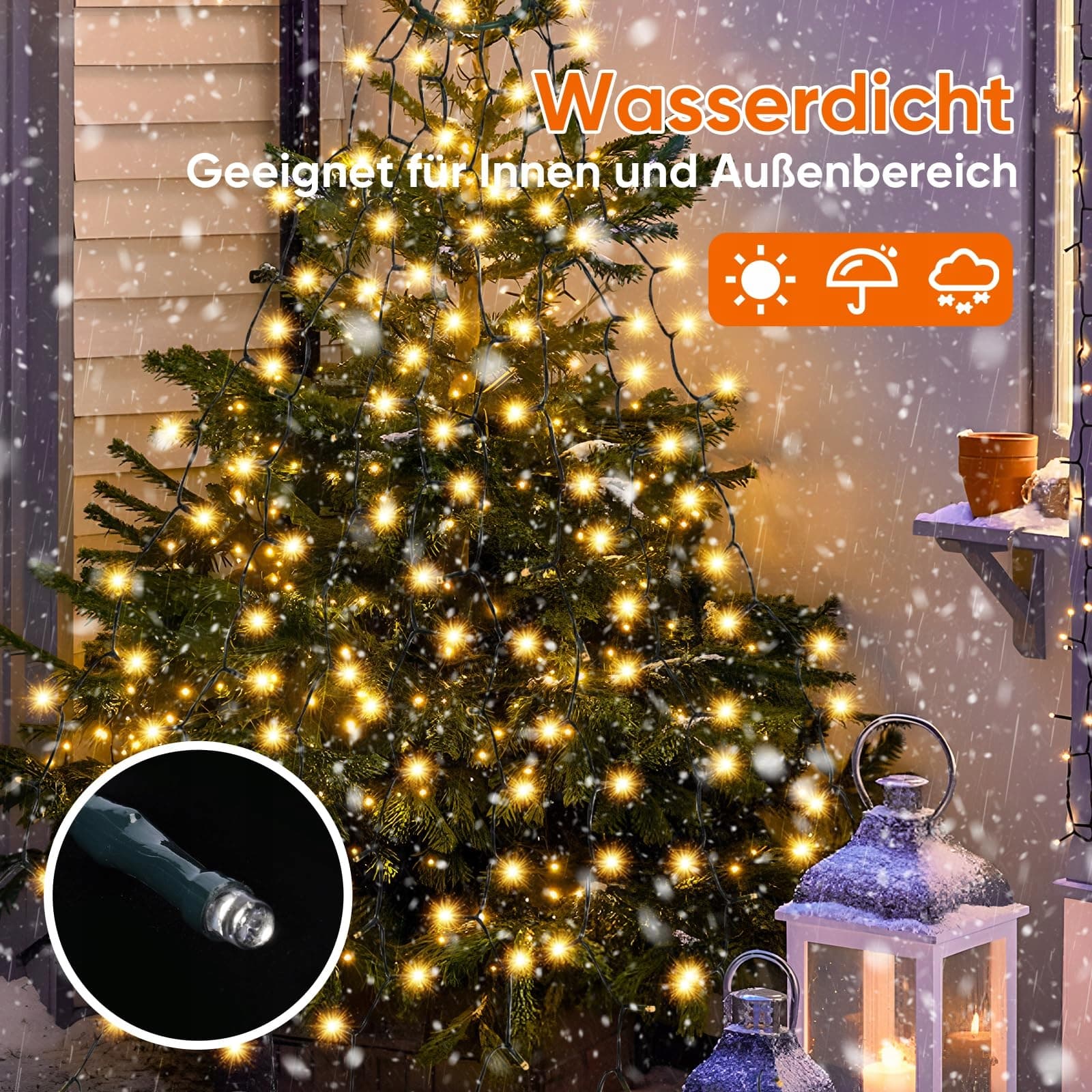 Wodoodporne i chronione przed zachlapaniem: IP44, Światełka LED wykonane z wodoodpornego materiału, dlatego nadają się do użytku wewnętrznego i zewnętrznego. (Proszę trzymać zasilacz z dala od wody.)