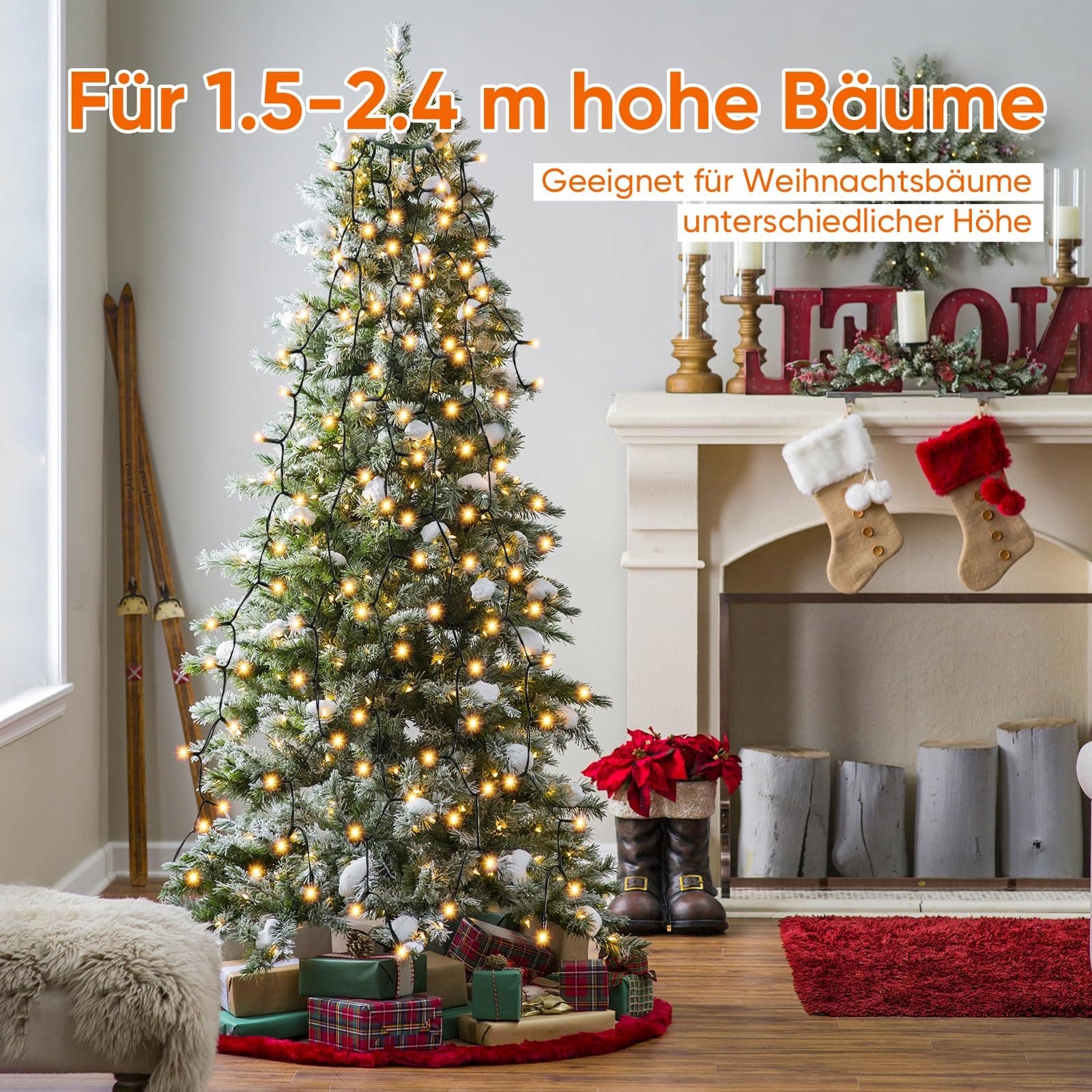 2m*8 Girland Oświetlenie Choinkowe (1,2 - 2,8m choinka) Światełka LED 24V z bezpiecznym zasilaczem + 5m przewód zasilający, 280 LED; Odstęp między lampami: 9cm; Wodoodporne.