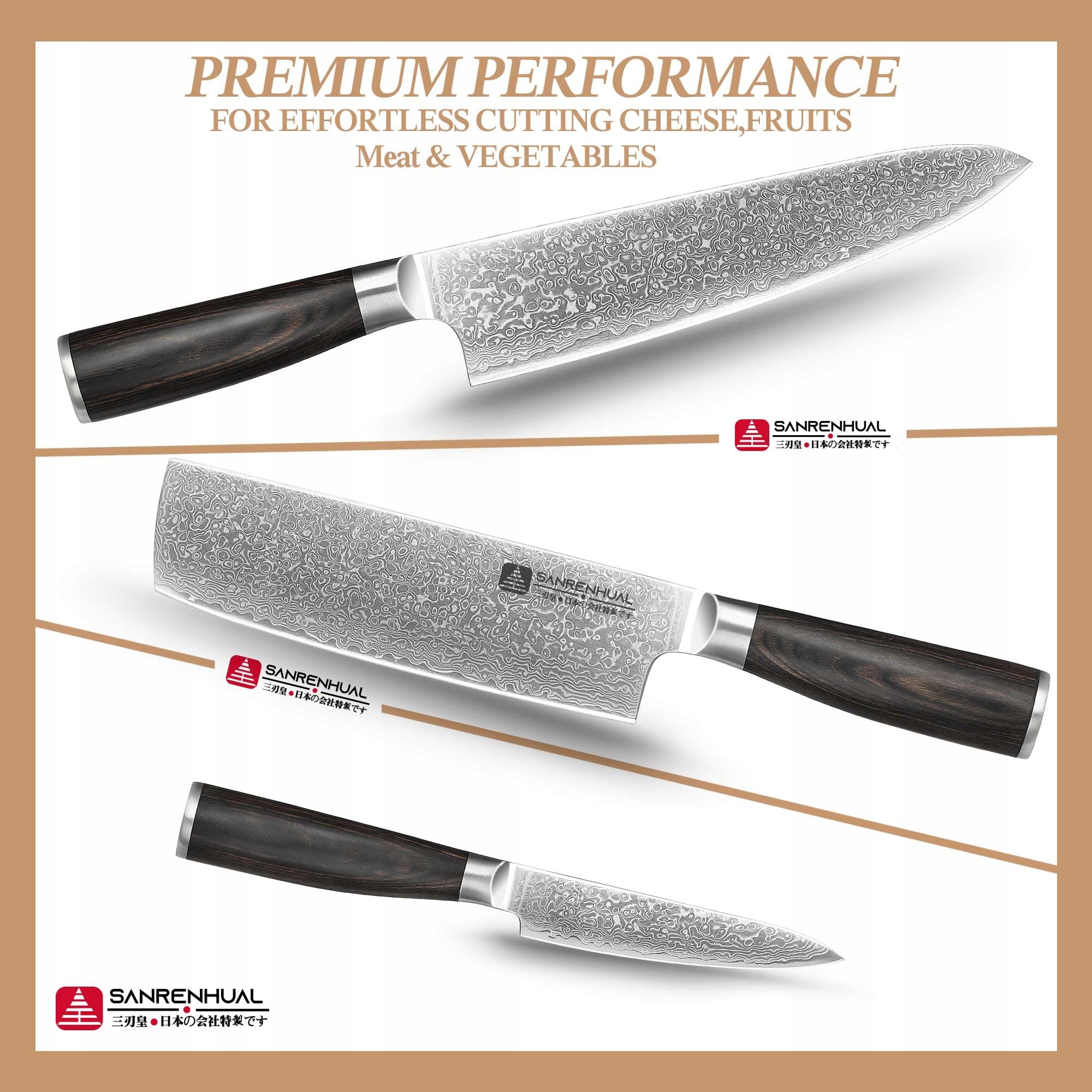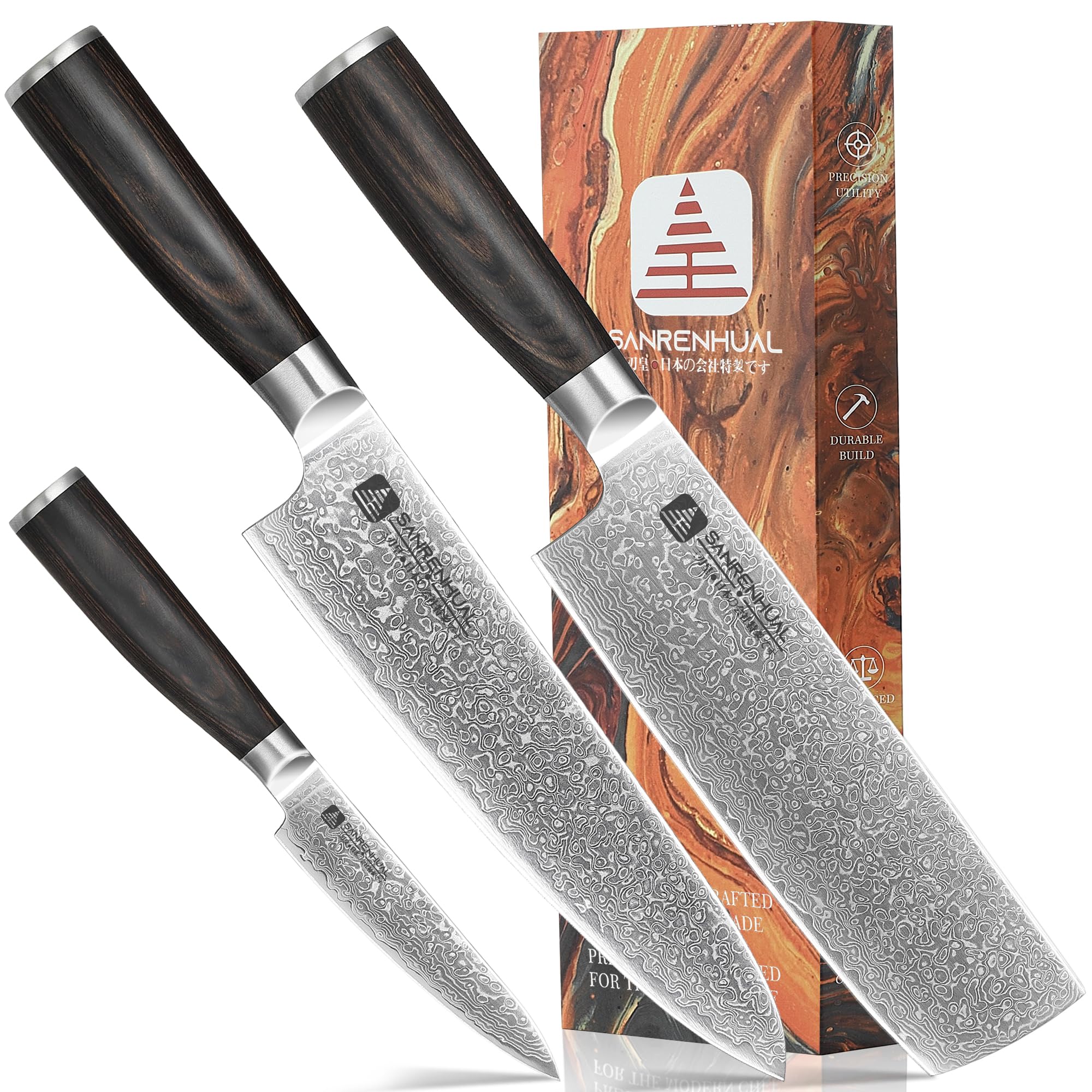 SANRENHUAL Japoński zestaw noży damasceńskich, 3-częściowy, Japoński zestaw noży kuchennych damasceńskich, 3-częściowy, Zestaw profesjonalnych japońskich noży o ostrzu jak brzytwa, Wykuty z wysokiej jakości damasceńskiej stali