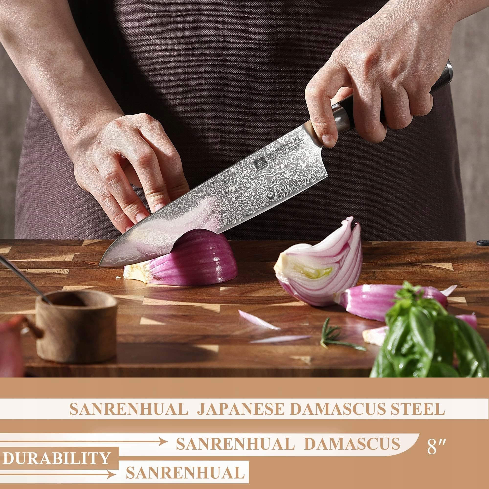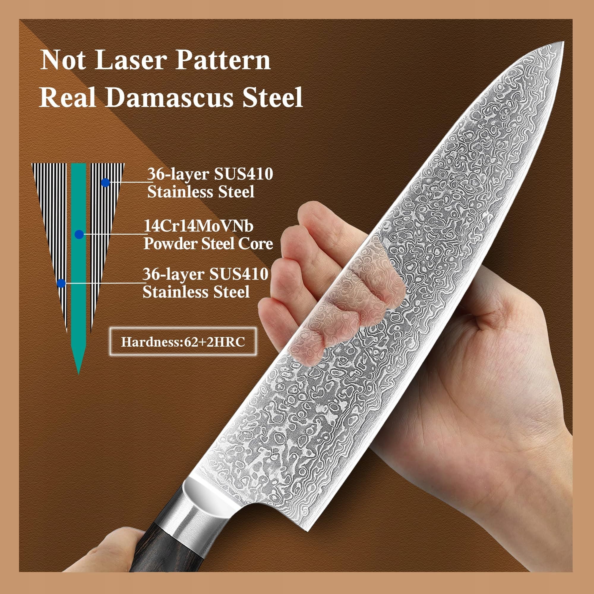 【Wysokiej jakości stal damasceńska】 Nóż kuchenny składa się z profesjonalnego rdzenia tnącego VG10, co poprawia trwałość i zwiększa sztywność. 67-warstwowa stal damasceńska ma twardość 60 ± 2 HRC i zachowuje swoją ostrość nawet po dłuższym użytkowaniu. Połączona z zaawansowanymi technikami kucia, tworzy profesjonalny nóż uniwersalny dla amatorów gotowania.