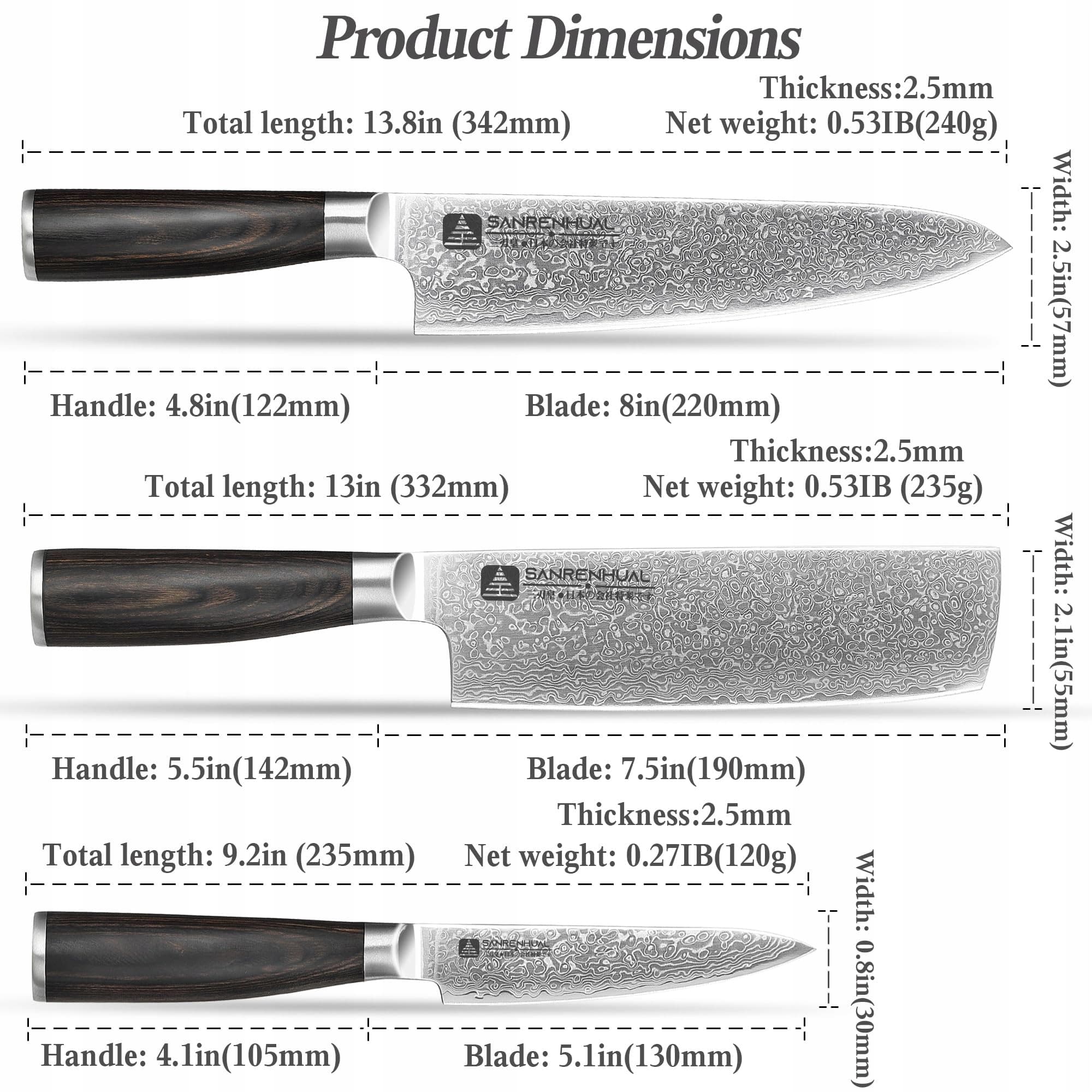 【Zestaw noży kuchennych damasceńskich】 3-częściowy zestaw noży kuchennych damasceńskich od SANRENHUAL spełnia wszystkie Twoje potrzeby kulinarne. Ten zestaw noży kuchennych zawiera nóż kuchenny 20 cm, nóż Nakiri 18 cm oraz nóż kuchenny 13 cm, idealny do codziennego gotowania, krojenia warzyw, owoców, chleba, filetów rybnych lub mięsa. Doskonały wybór dla amatorów gotowania i profesjonalnych kucharzy.