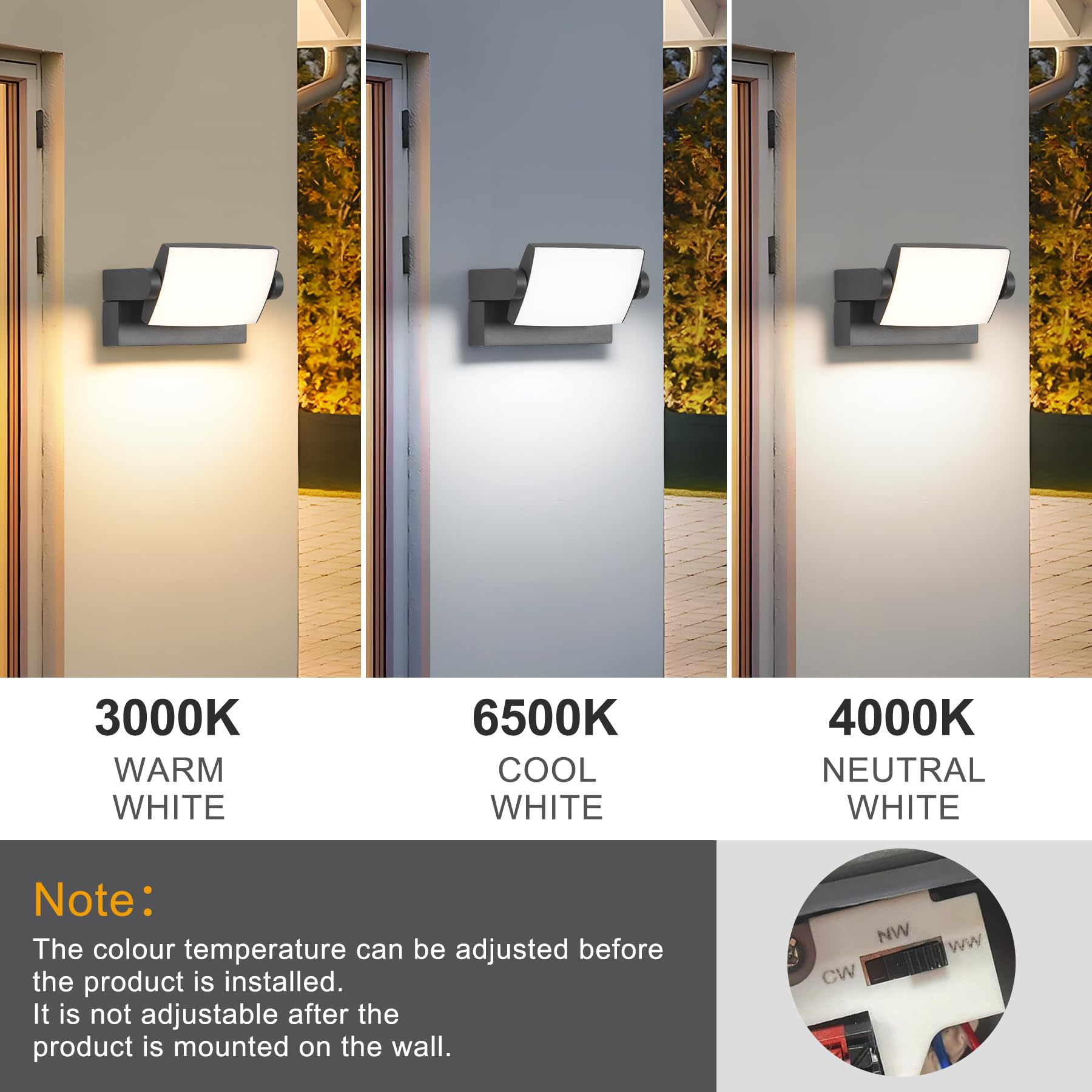 【3 tryby kolorów】Lampa zewnętrzna SANSHI posiada regulowaną temperaturę barwową z 3 trybami do wyboru: ciepła biel (3000K), naturalna biel (4000K) oraz zimna biel (6500K). Przed zamontowaniem kinkietu na ścianie można wybrać pożądaną temperaturę barwową spośród trzech opcji, przełączając przycisk temperatury barwowej na tylnej stronie klosza kinkietu. Różne temperatury barwowe pozwalają tworzyć różne nastroje, które odpowiadają Twoim potrzebom w różnych sytuacjach i porach dnia. Należy zauważyć, że po instalacji kinkietu nie można już zmieniać temperatury barwowej.