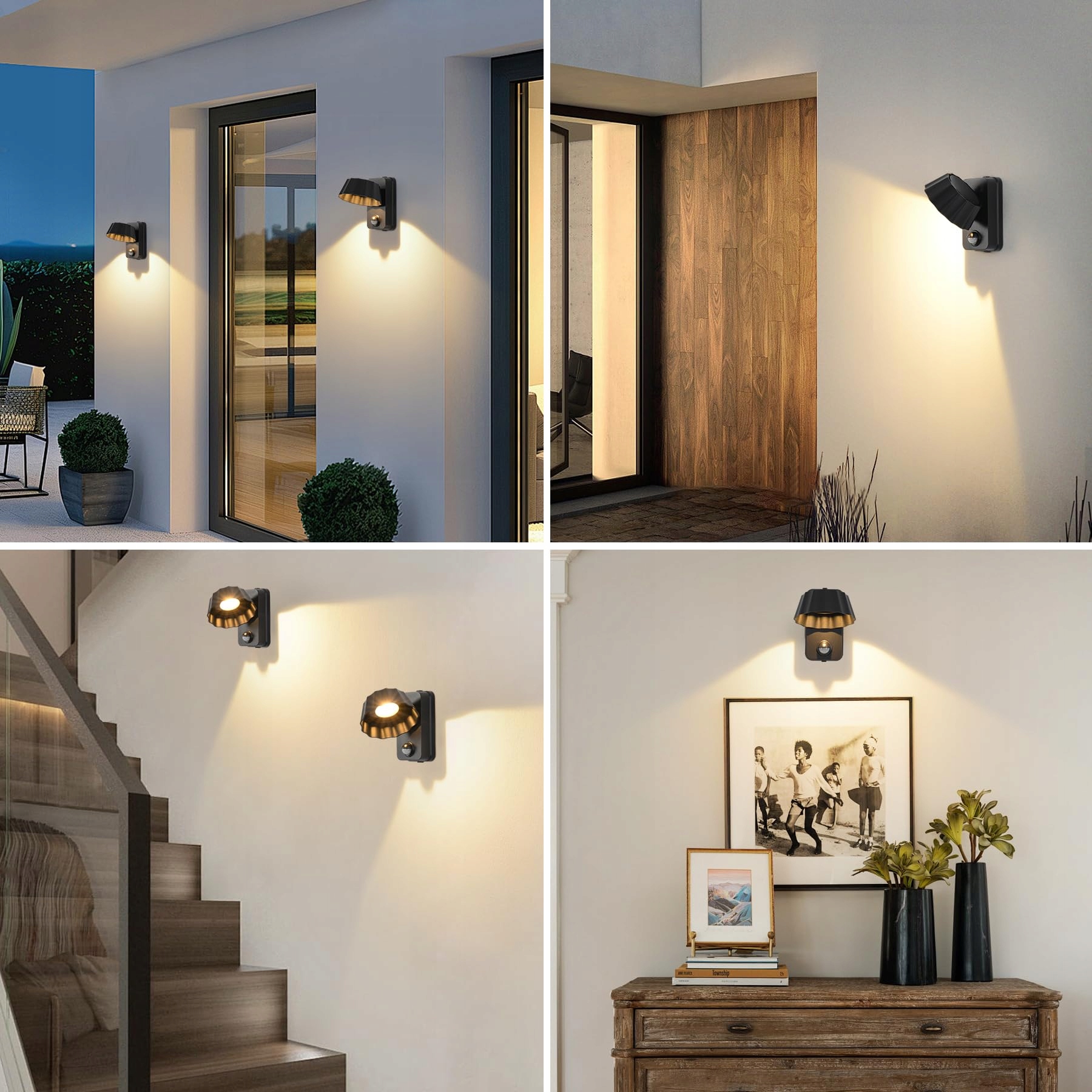 SANSHI Lampa ścienna z czujnikiem ruchu, 10W lampa zewnętrzna i wewnętrzna, wodoodporna LED lampa ścienna IP65, lampa zewnętrzna z regulowanym panelem 3000K ciepła biel, lampa ścienna do ogrodu, tarasu, korytarza, czarna