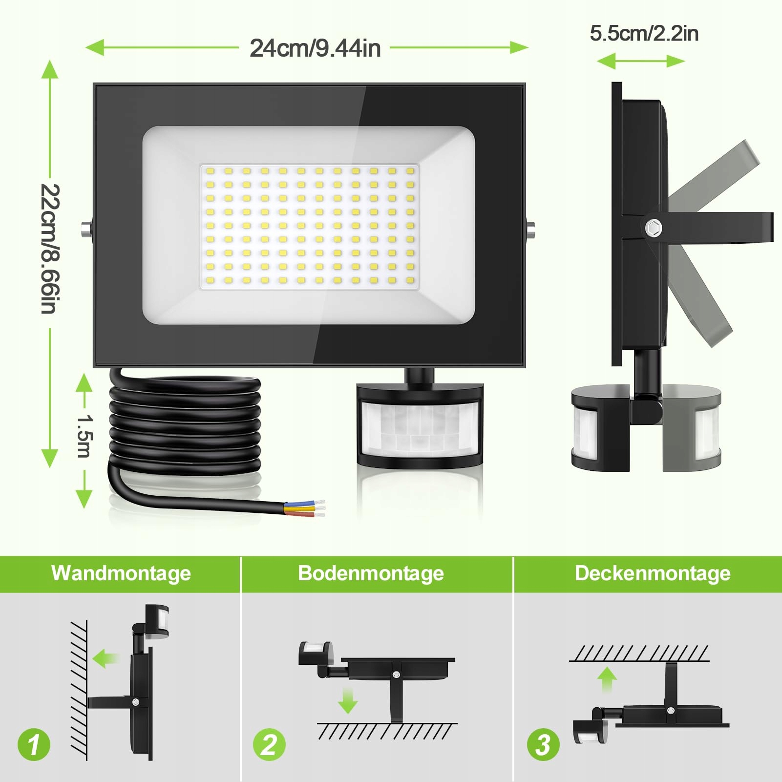 【Szerokie zastosowanie】 Czujnik PIR może być ustawiony pionowo o 180° i poziomo o 360°. Regulowany metalowy stojak 180° oraz kabel o długości 0,75 m. Dzięki temu LED reflektor zewnętrzny można zamontować dowolnie, np. na ścianie lub suficie, wiszący lub odsunięty od ściany. Nadaje się do użytku wewnątrz i na zewnątrz, tam gdzie potrzebne jest oświetlenie, jak ogrody, tarasy, garaże, werandy, podwórka, korytarze, schody, narożniki, ścieżki, boiska sportowe, warsztaty i piwnice.