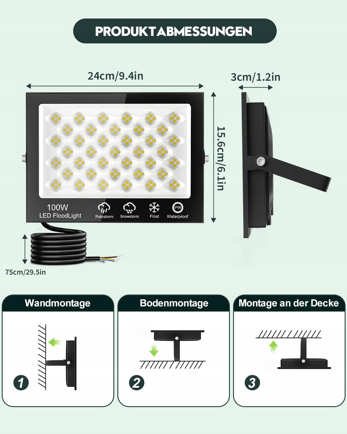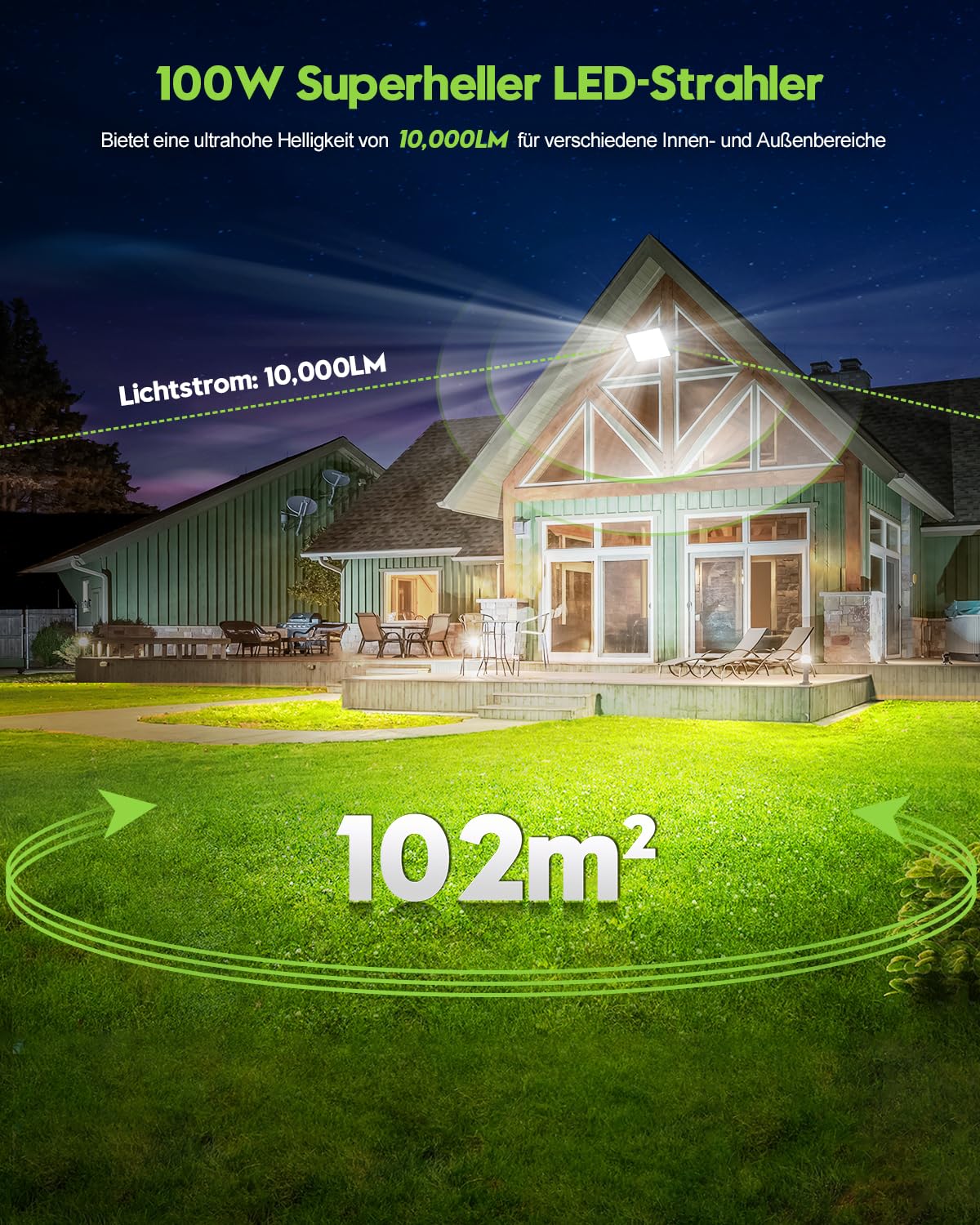 [Wysoka jasność]: Nasz 100W reflektor zewnętrzny oferuje 10 000 lumenów zimnego światła 6500K o doskonałej wydajności świetlnej. W porównaniu z tradycyjnymi lampami halogenowymi, może zaoszczędzić do 80% energii, skutecznie obniżając rachunki za prąd, idealny do uzyskania wysokiej wydajności przy niskim zużyciu energii.