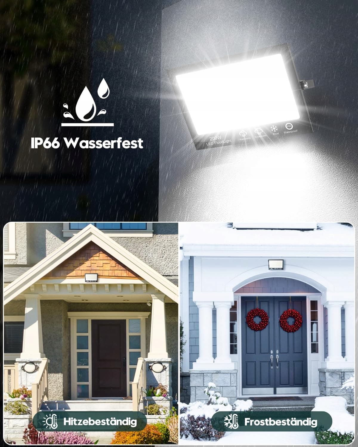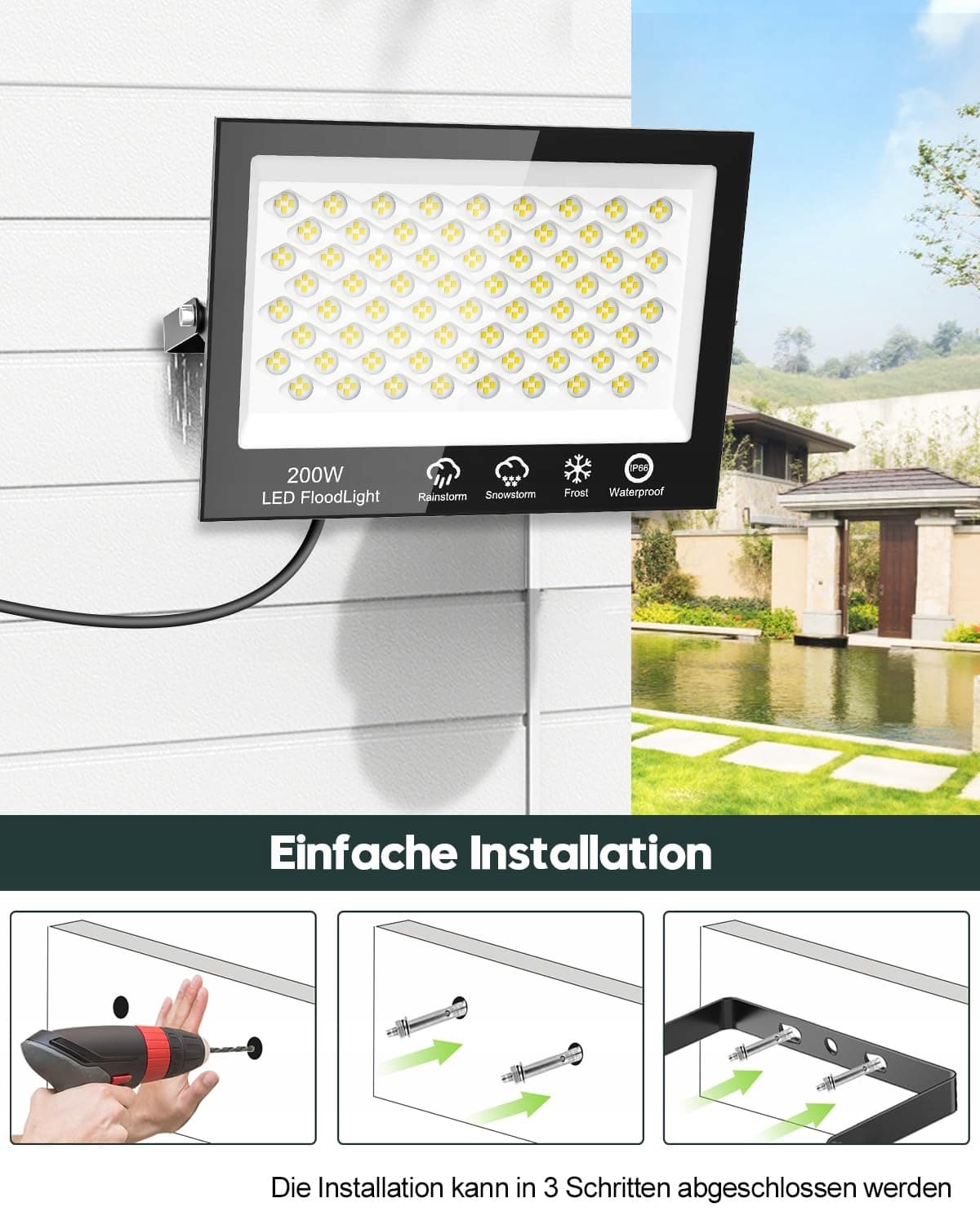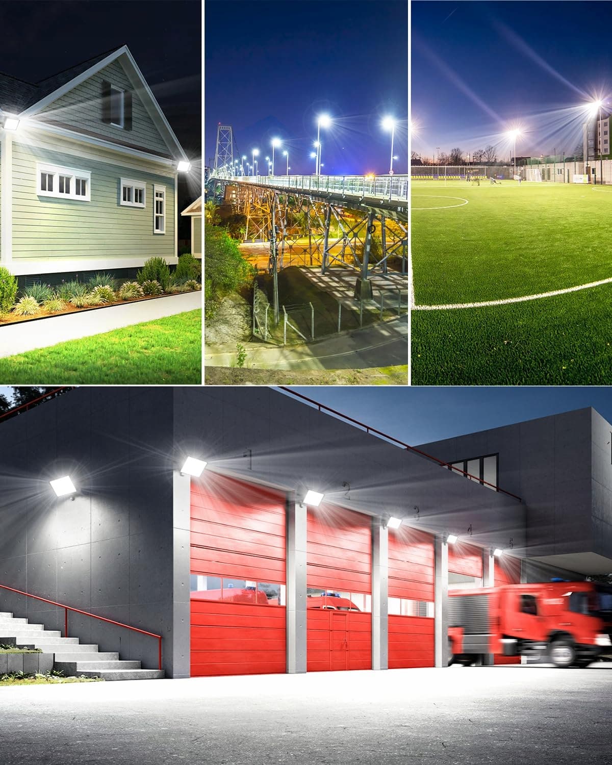 [WSZECHSTRONNE ZASTOSOWANIE]: Dzięki klasie ochrony IP65 ten reflektor LED jest skutecznie odporny na kurz, zachlapania i warunki atmosferyczne, co czyni go idealnym do oświetlenia wewnętrznego i zewnętrznego. Na przykład: podwórka przednie i tylne, ogrody, balkony, garaże, ogrodzenia, mosty, dworce, parki, hotele, tablice reklamowe, budynki, place budowy, boiska sportowe, parkingi, stadiony, terminale i inne miejsca. Wszędzie tam, gdzie potrzebne jest światło, sprawdza się doskonale.