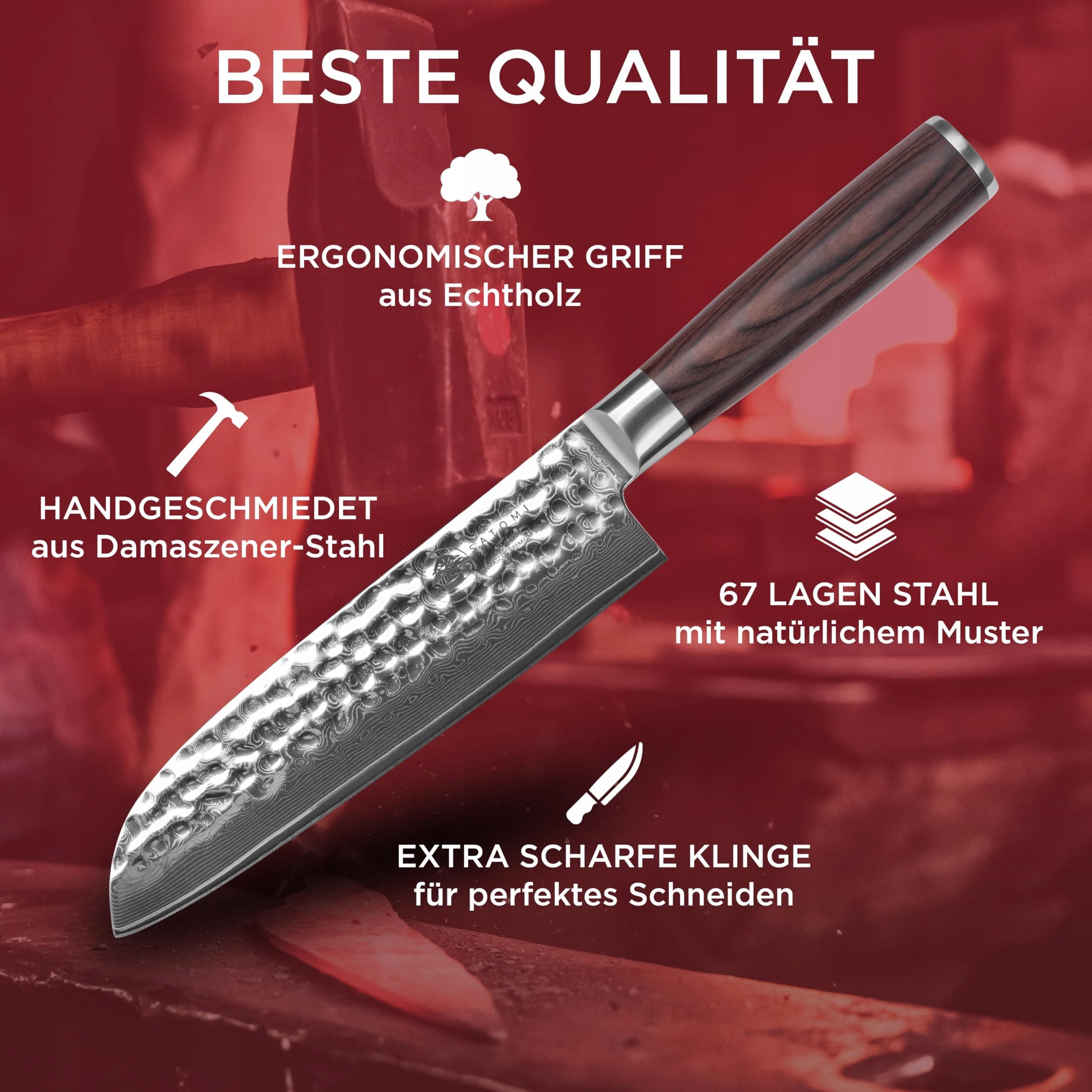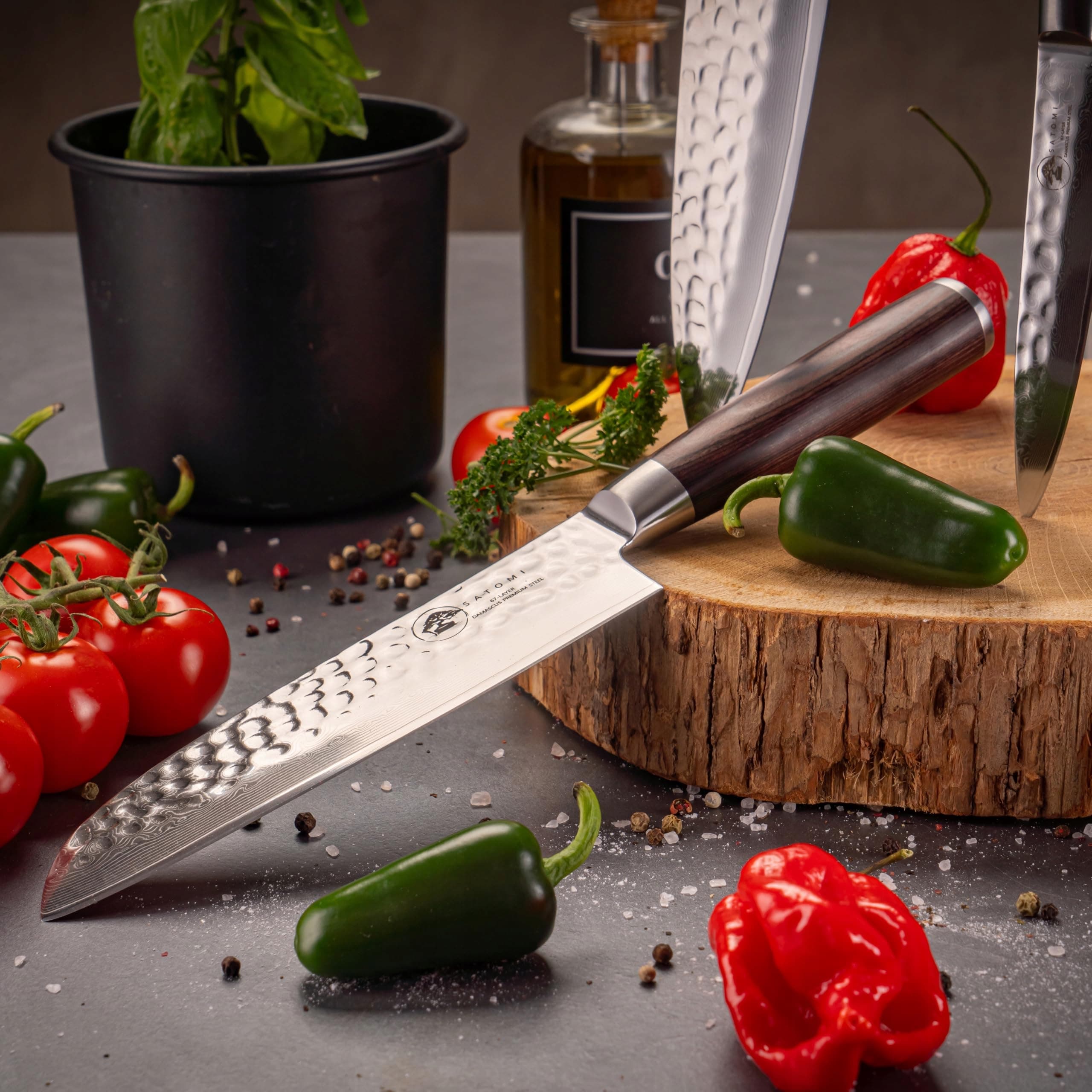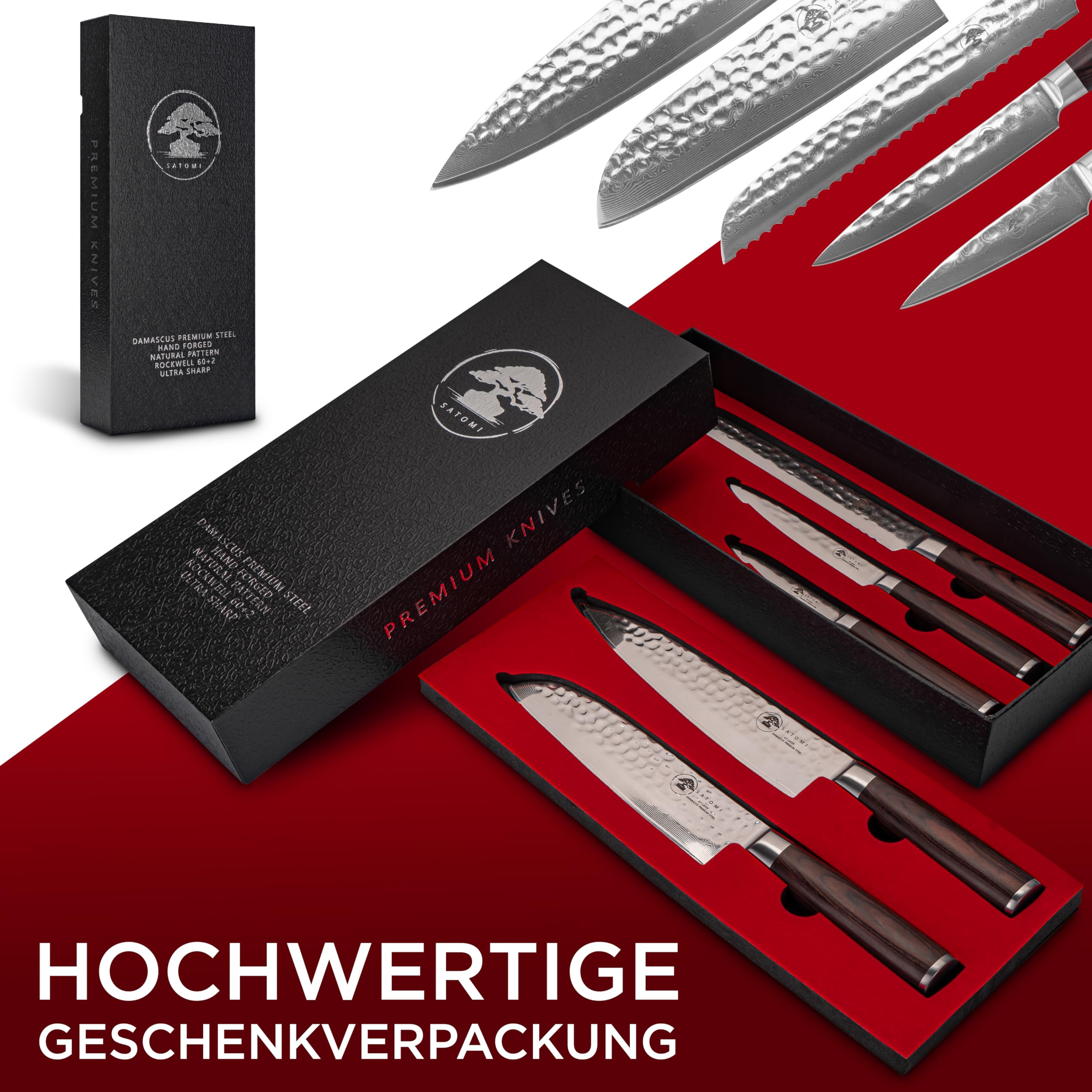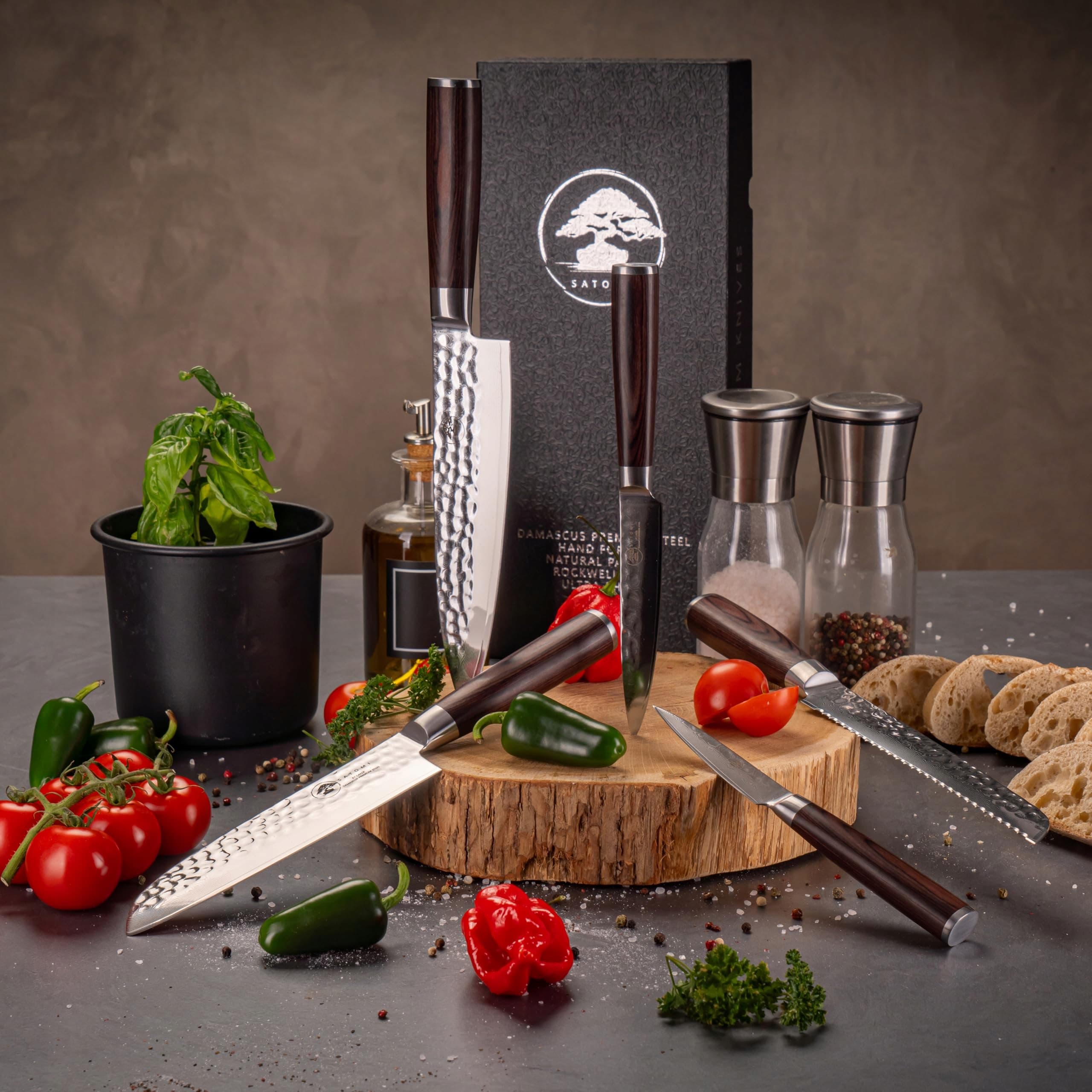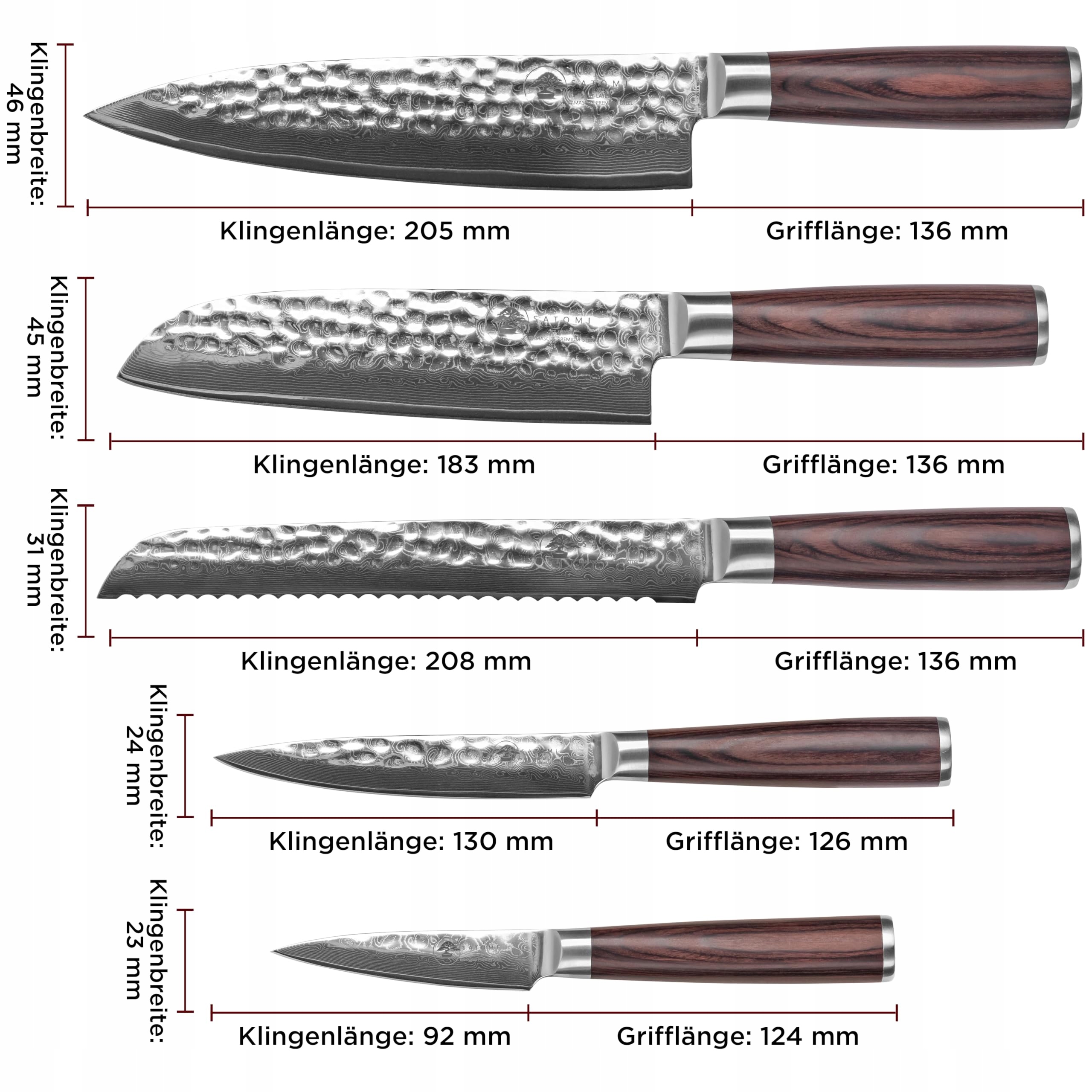 Zestaw 5 noży kuchennych SATOMI® z damasceńskiej stali - 67 warstw w tradycyjnym japońskim stylu - nóż szefa kuchni, nóż santoku, nóż do chleba, nóż uniwersalny, nóż do owoców z eleganckim uchwytem z drewna pakkaholz