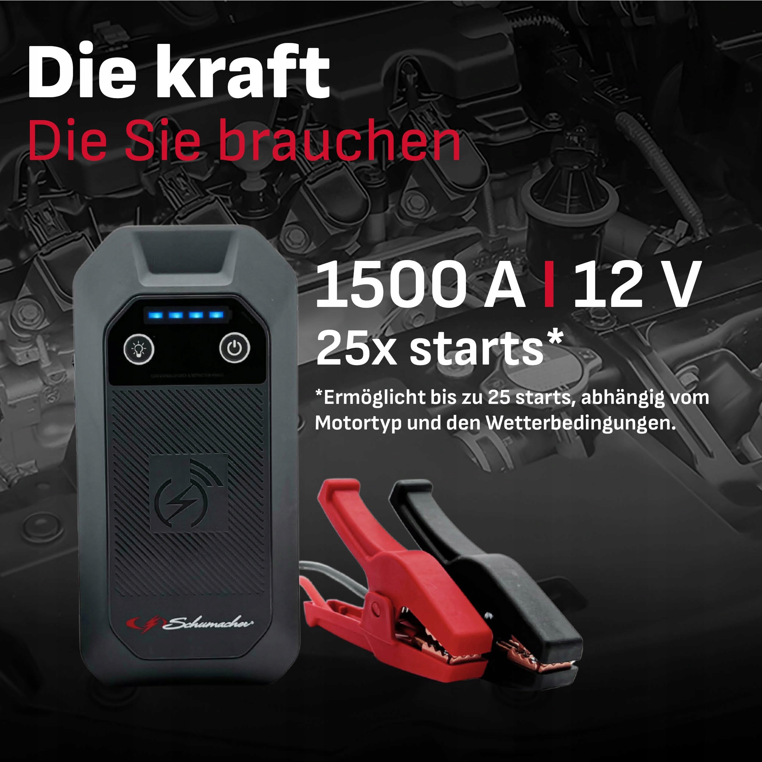 Schumacher Electric Compact SBX505 - Auto rozruch 1500A 12V - Lithiumowy booster z zaciskami bezpieczeństwa - Benzyna 8L / Diesel 6L - USB-C, ładowanie bezprzewodowe - lampa LED - Override i podgrzewanie wstępne