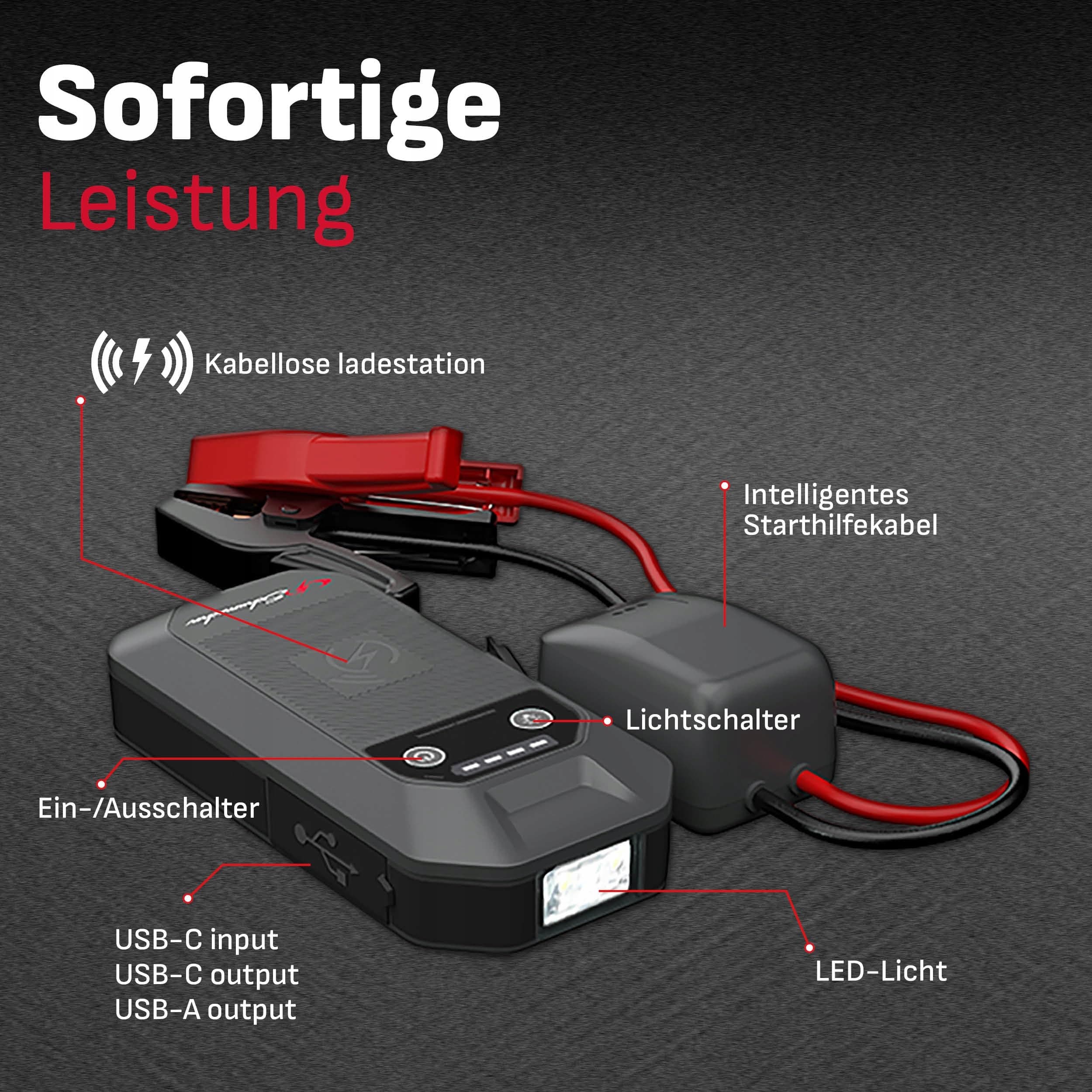 Wysoka pojemność akumulatora do wielokrotnego rozruchu: Wydajny akumulator 6400 mAh umożliwia wiele rozruchów bez konieczności częstego ładowania. Ponadto smartfony, tablety i inne urządzenia mobilne mogą być ładowane w podróży przez USB lub bezprzewodowo, co znacznie zwiększa użyteczność.