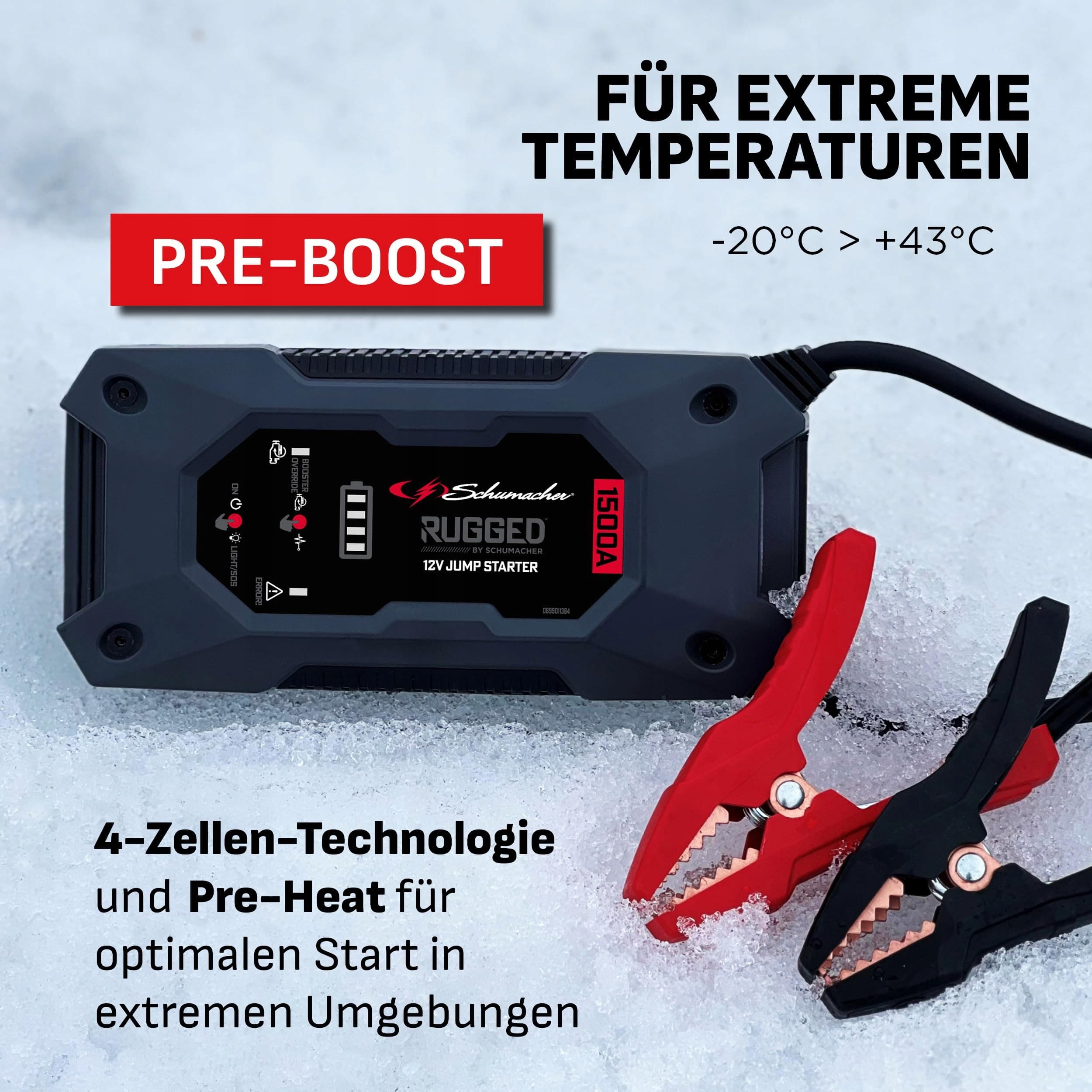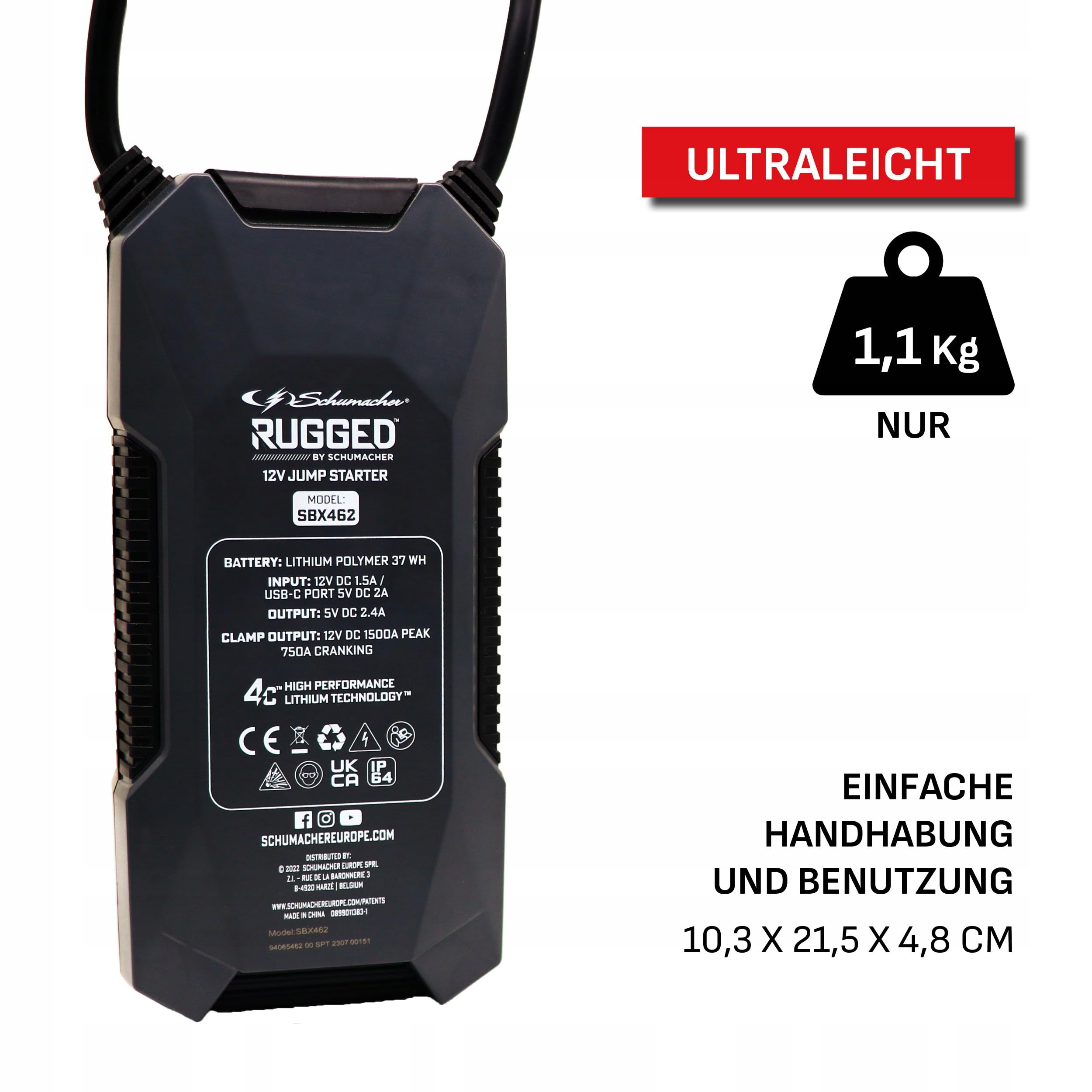 Technologia 4-komorowa: Litowy booster SBX462 posiada opatentowaną przez Schumacher technologię 4-komorową, która zapewnia zwiększoną moc chwilową do 1500A. Wytrzymuje ekstremalne temperatury (-20°C > +43°C) i jest lekki oraz kompaktowy