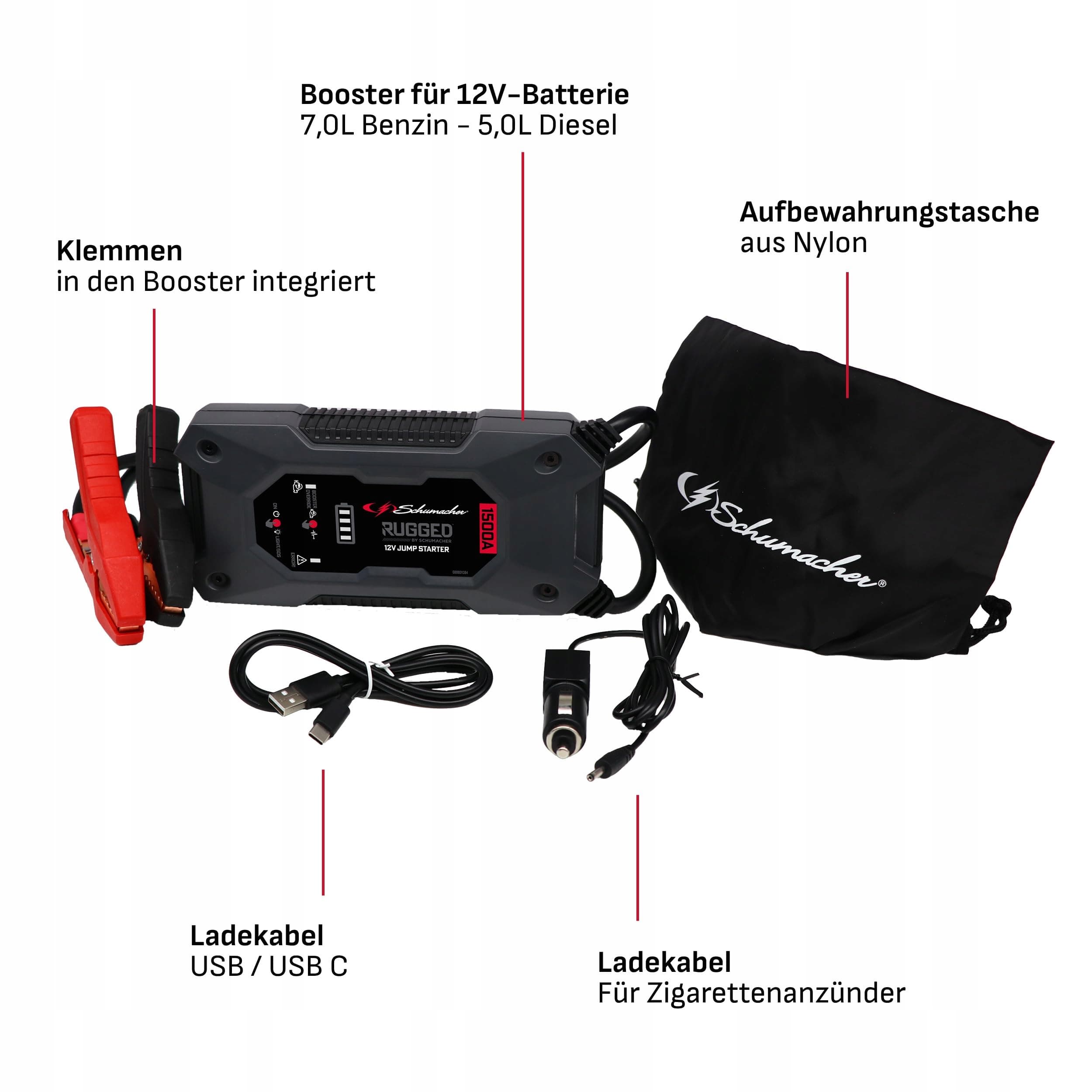 Schumacher Rugged SBX 462 - Starthilfe z powerbanką - Akumulator litowo-jonowy 1500A 12V - Booster dla pojazdów do 7L benzyny, 5L diesla - Latarka - USB 2,4A wyjście, 2,0A wejście - IP64 wodoodporny