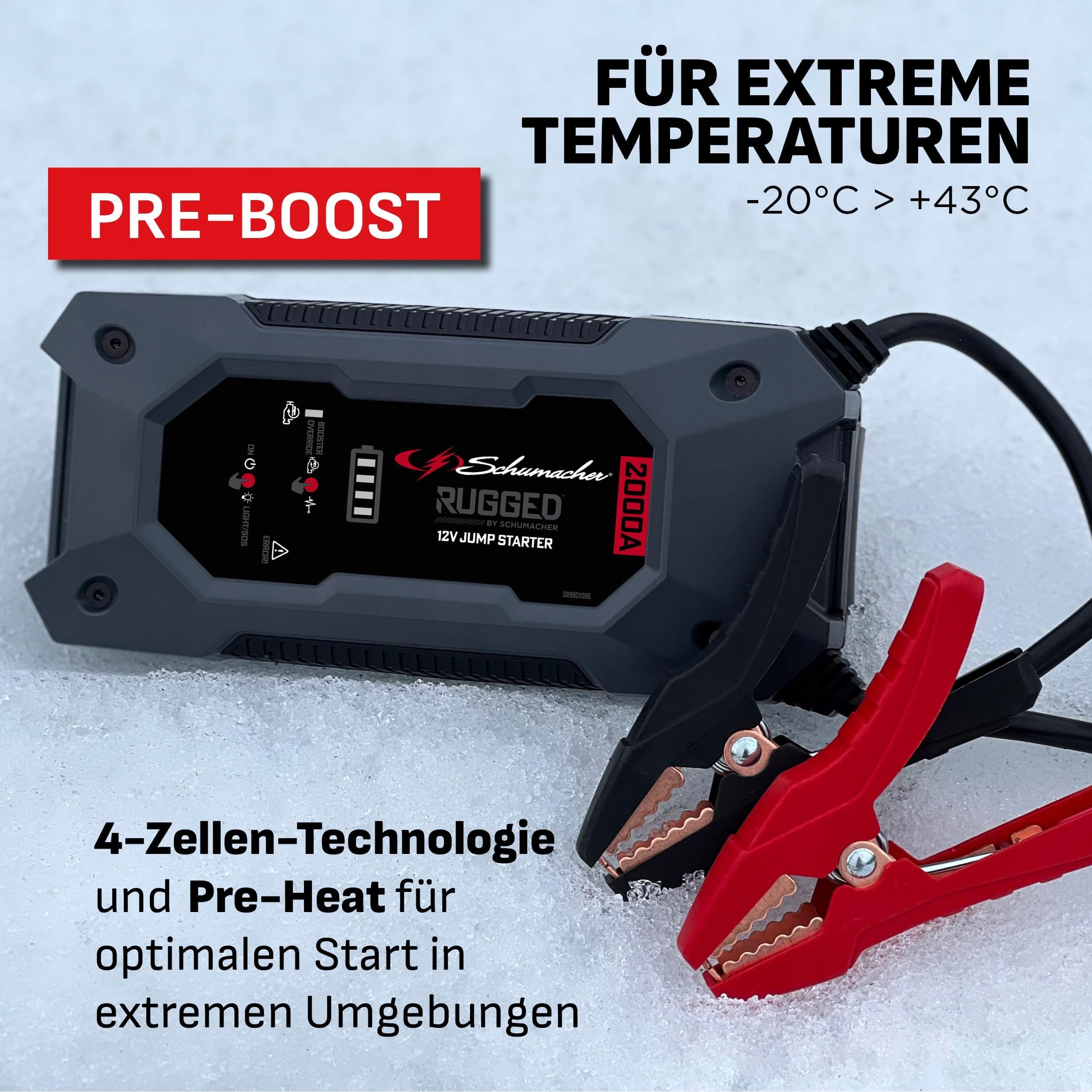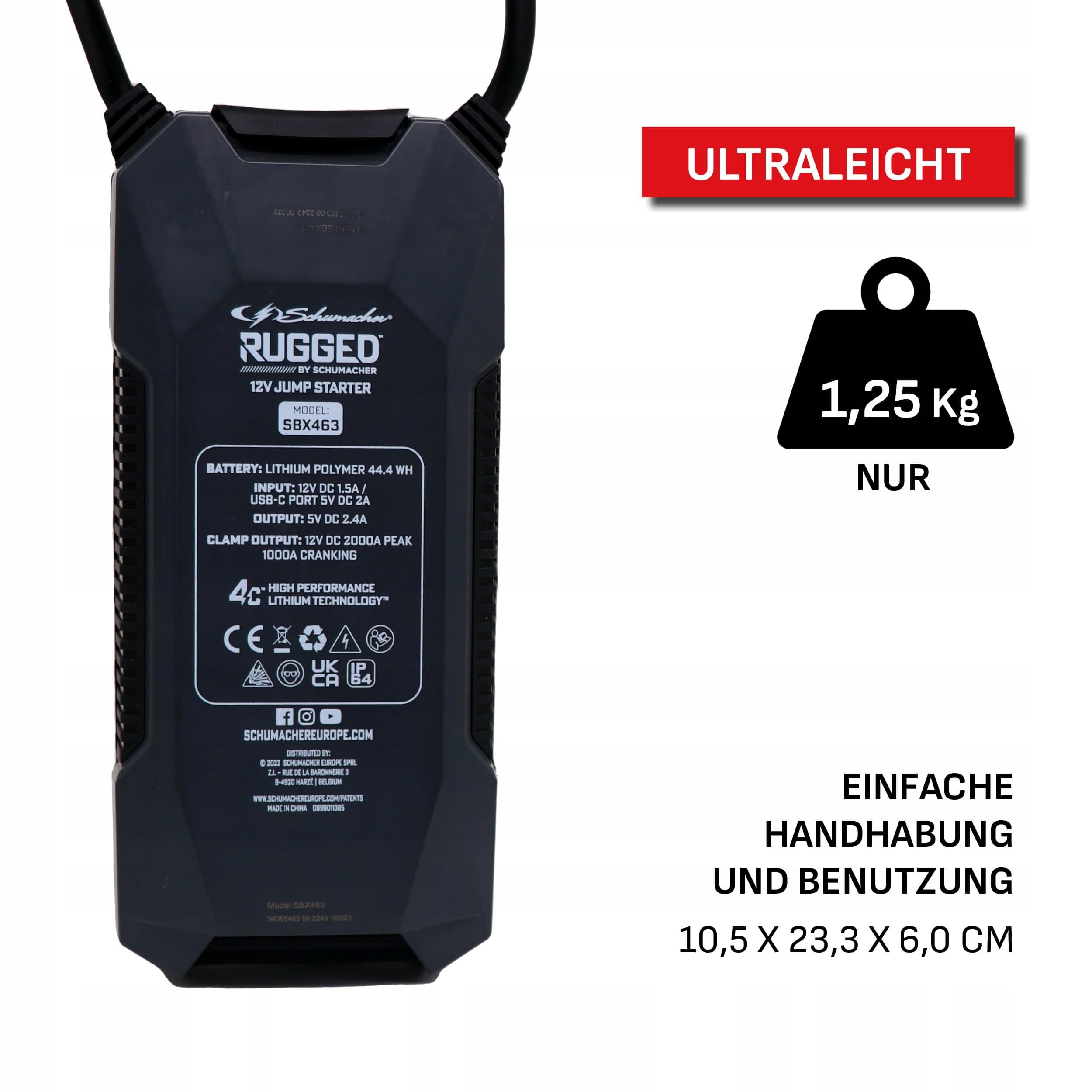Technologia 4-komorowa: Litowy booster SBX463 posiada opatentowaną przez Schumacher technologię 4-komorową, która zapewnia zwiększoną moc chwilową do 2000A. Wytrzymuje ekstremalne temperatury (-20°C > +43°C) i jest lekki oraz kompaktowy