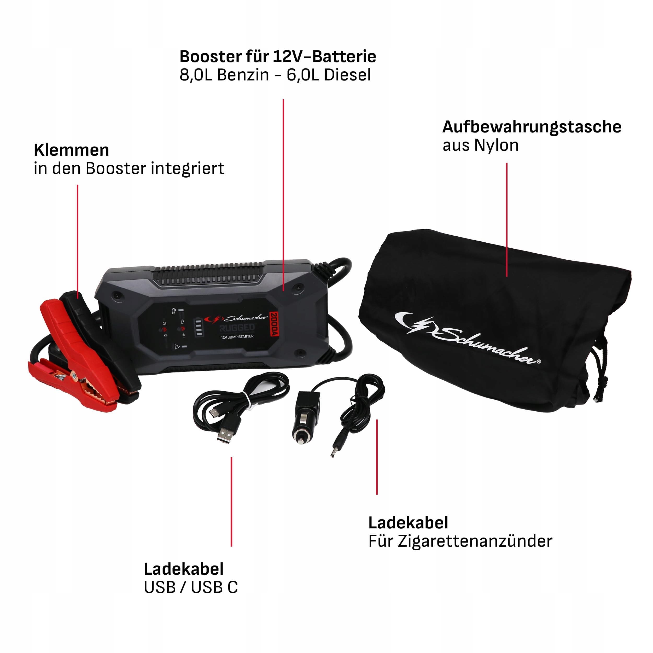 Schumacher Rugged SBX 463 - Starthilfe z powerbanką - Bateria litowo-jonowa 2000A 12V - Booster dla pojazdów do 8L benzyny, 6L diesla - Latarka - USB 2,4A wyjście, 2,0A wejście - IP64 wodoodporny