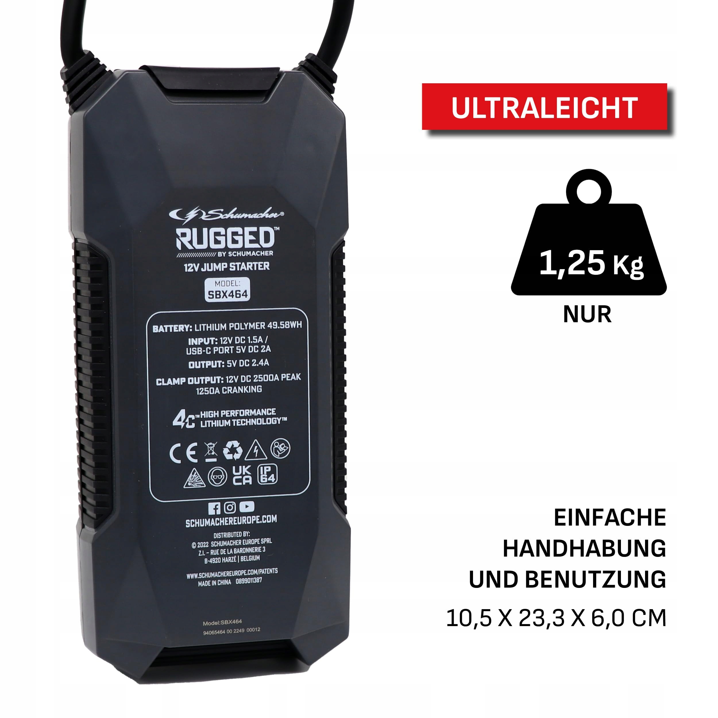 Schumacher Rugged SBX 464 - Pomoc przy uruchamianiu z powerbankiem - Akumulator litowo-jonowy 2500A 12V - Booster do pojazdów do 10L benzyny, 7L diesla - Latarka - USB 2,4A wyjście, 2,0A wejście - IP64 wodoodporny