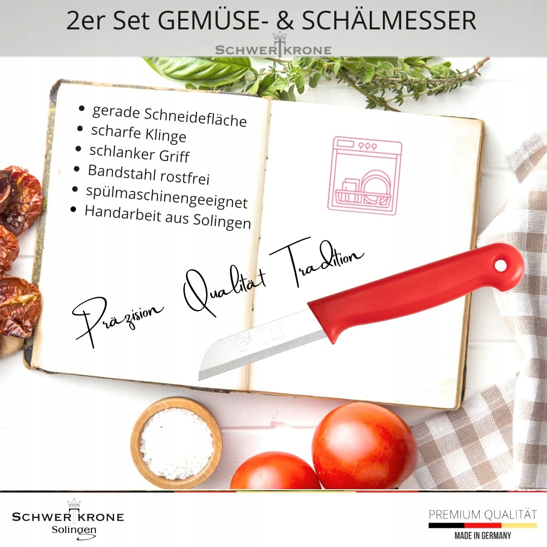 Schwertkrone® Nóż obierak 2 szt. [WYPRODUKOWANO W SOLINGEN - NIEMCY] - Nóż do warzyw Nóż do owoców - Mały ostry nóż kuchenny - Nóż do krojenia Nóż obierak do ziemniaków - Nóż uniwersalny (2x czerwony - 6 cm ostrze)