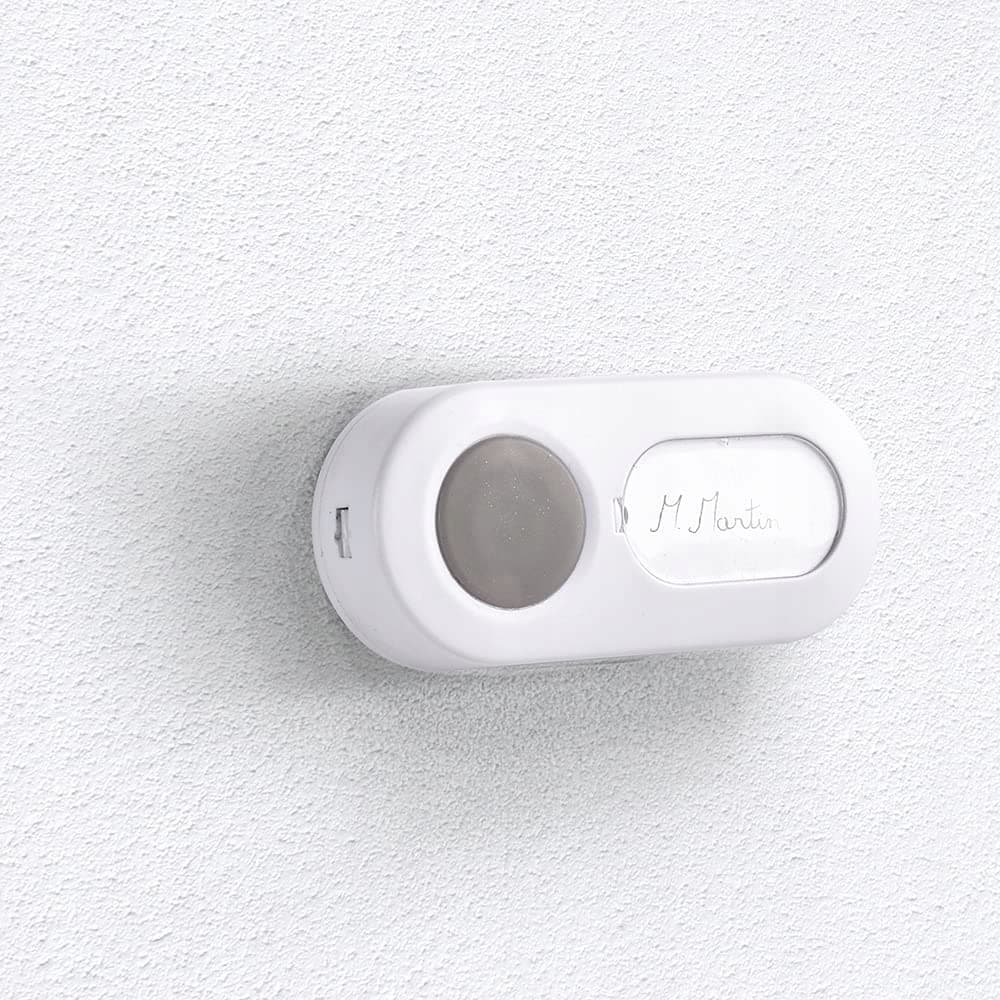 Łatwa instalacja Przycisk dzwonka można przykręcić lub przykleić do ściany (śruby i taśma dwustronna są w zestawie), a dzwonek można zainstalować lub powiesić. Ponadto nie jest wymagane podłączenie do prądu, bezprzewodowy dzwonek OneBell 100 działa na baterie (1 bateria CR2032 3-V dla dzwonka i 3 baterie LR06 AA 1,5 V dla dzwonka wewnętrznego nie wchodzą w skład zestawu)