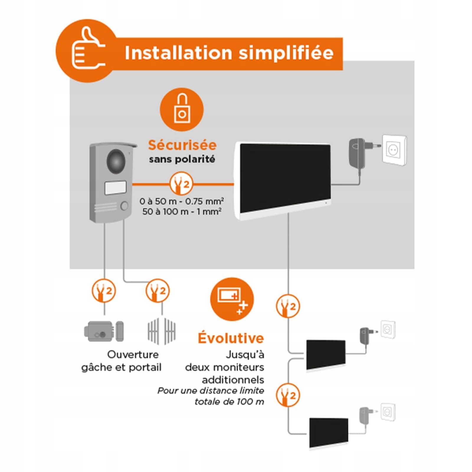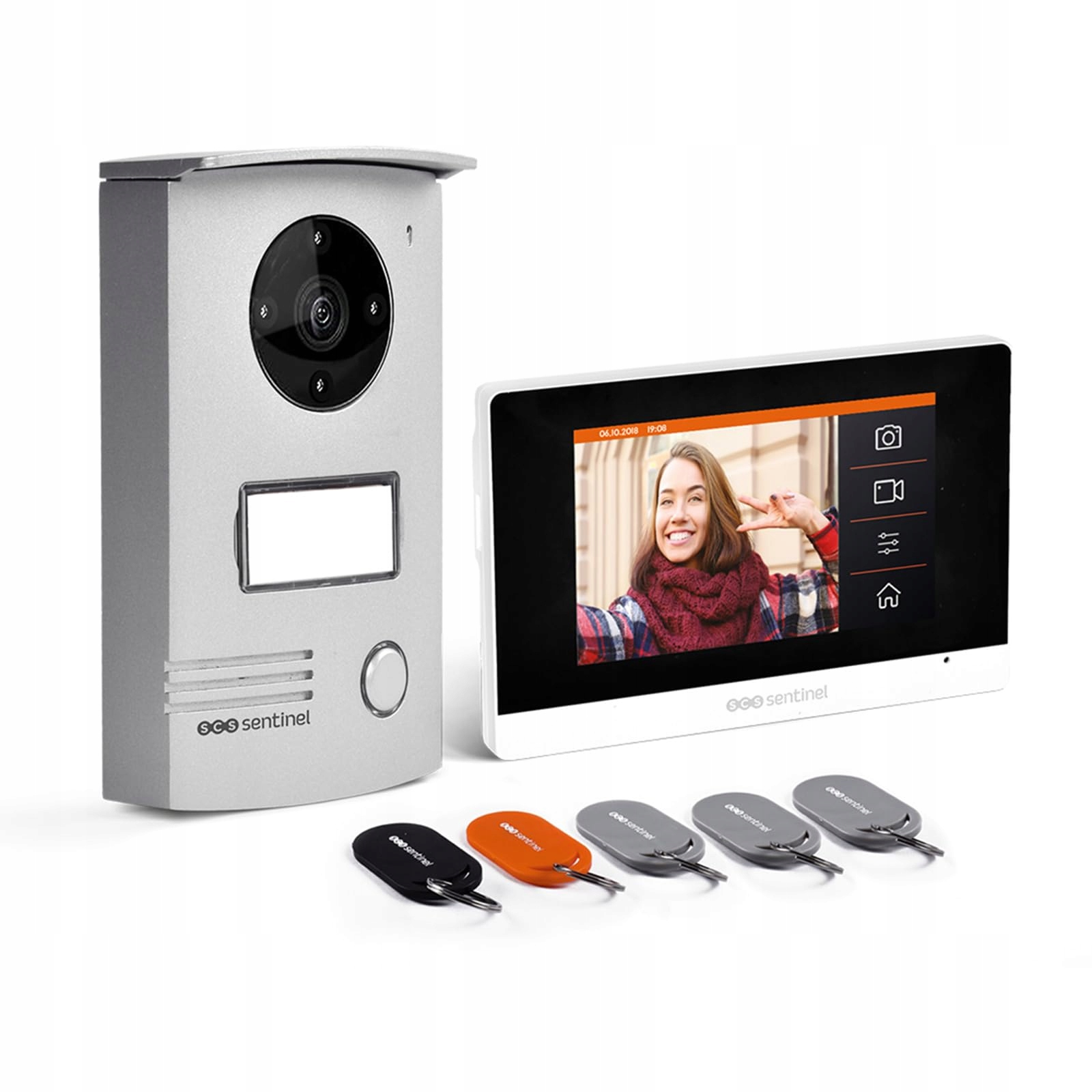 Funkcje: Ten wideotelefon z identyfikatorem zarządza otwieraniem zarówno od wewnątrz, jak i na zewnątrz, wiele melodii 6, audio i wideo „-ekran 7 (data i godzina), stacja bramowa z wyświetlaczem, przyciskiem dzwonka i podświetlaną tabliczką z nazwiskiem, widzenie nocne