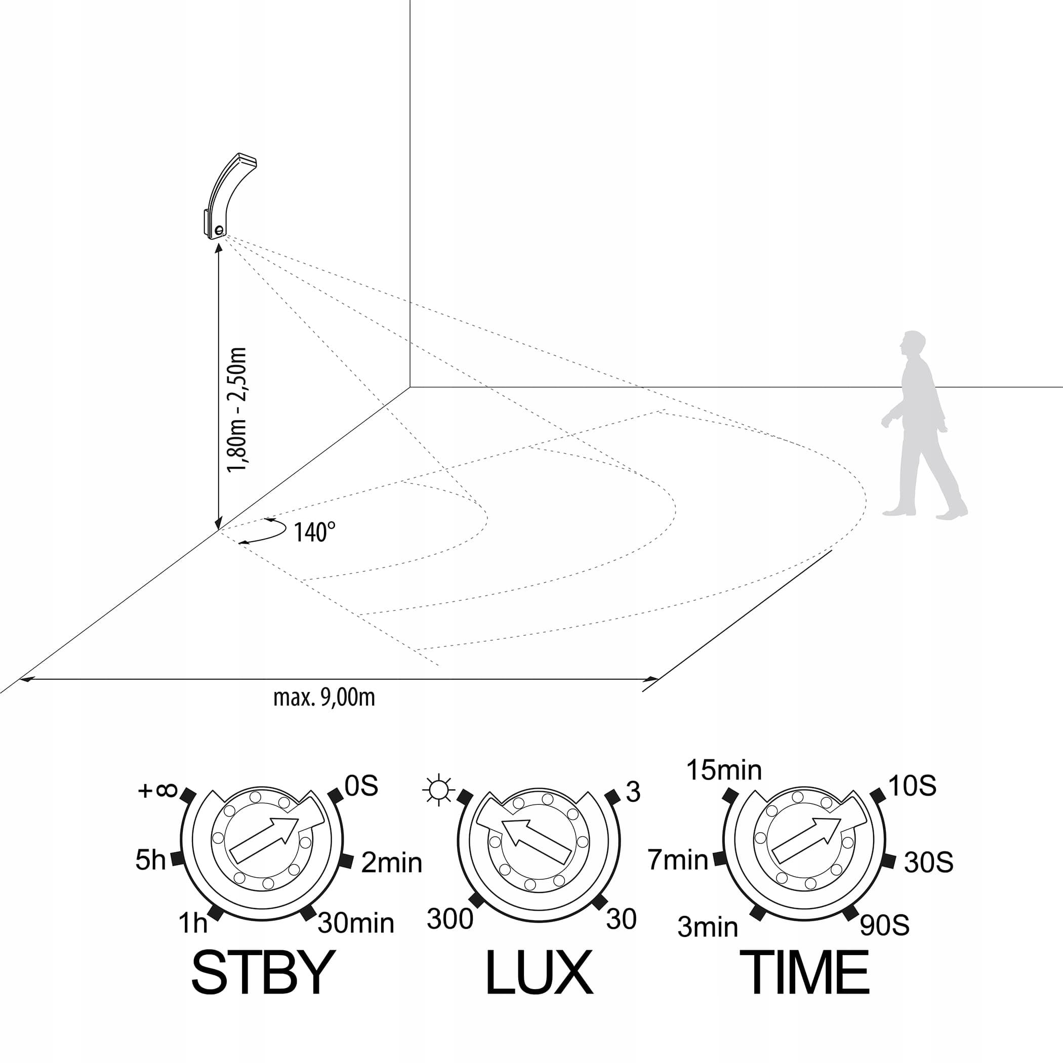 Czujnik ruchu można regulować pod kątem czułości włączenia (3-2000LUX) oraz czasu świecenia (10sek-5min), zasięg detekcji wynosi 9m i 140°.