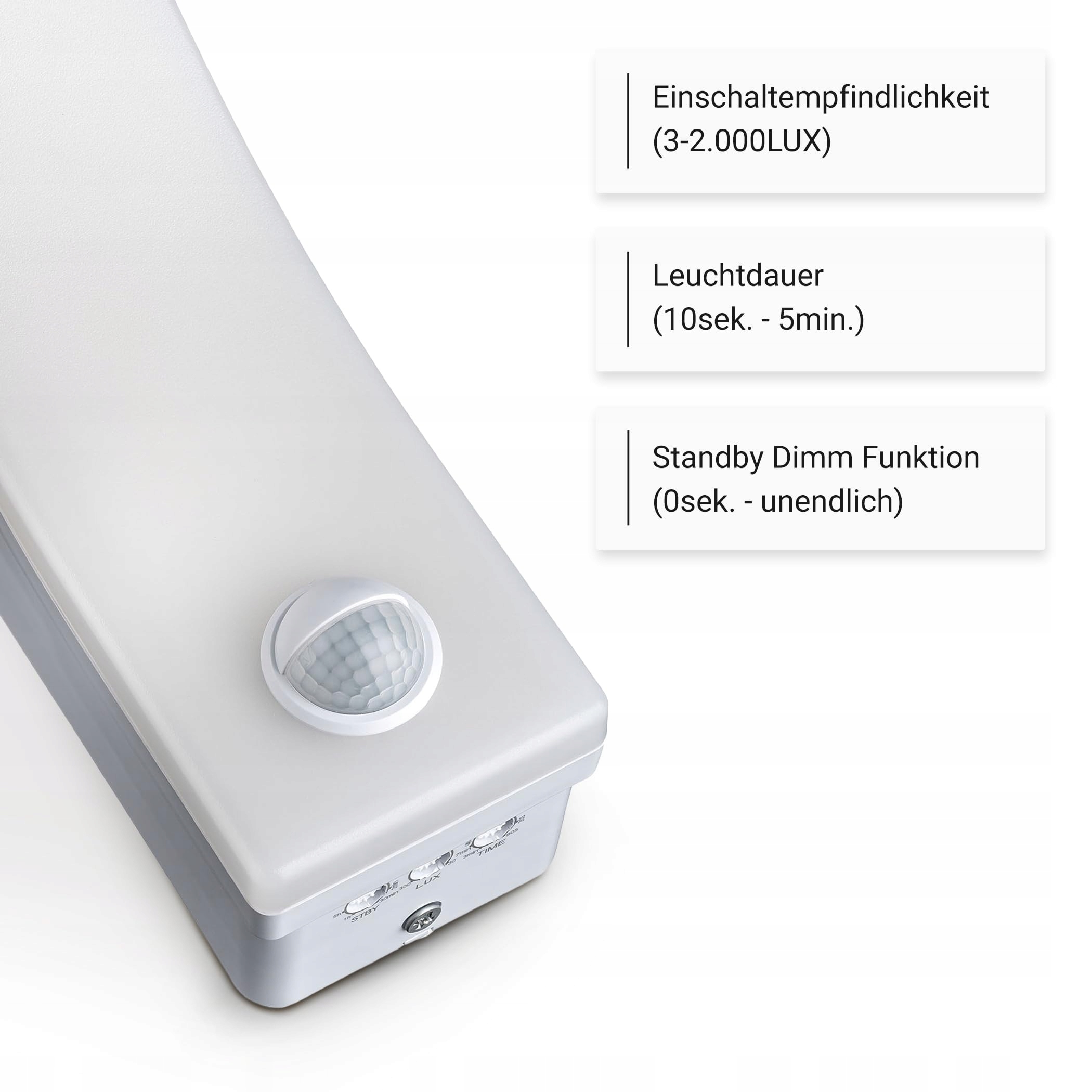 Czujnik ruchu można regulować pod kątem czułości włączenia (3-2000LUX) oraz czasu świecenia (10sek-5min), zasięg detekcji wynosi 9m i 140°.