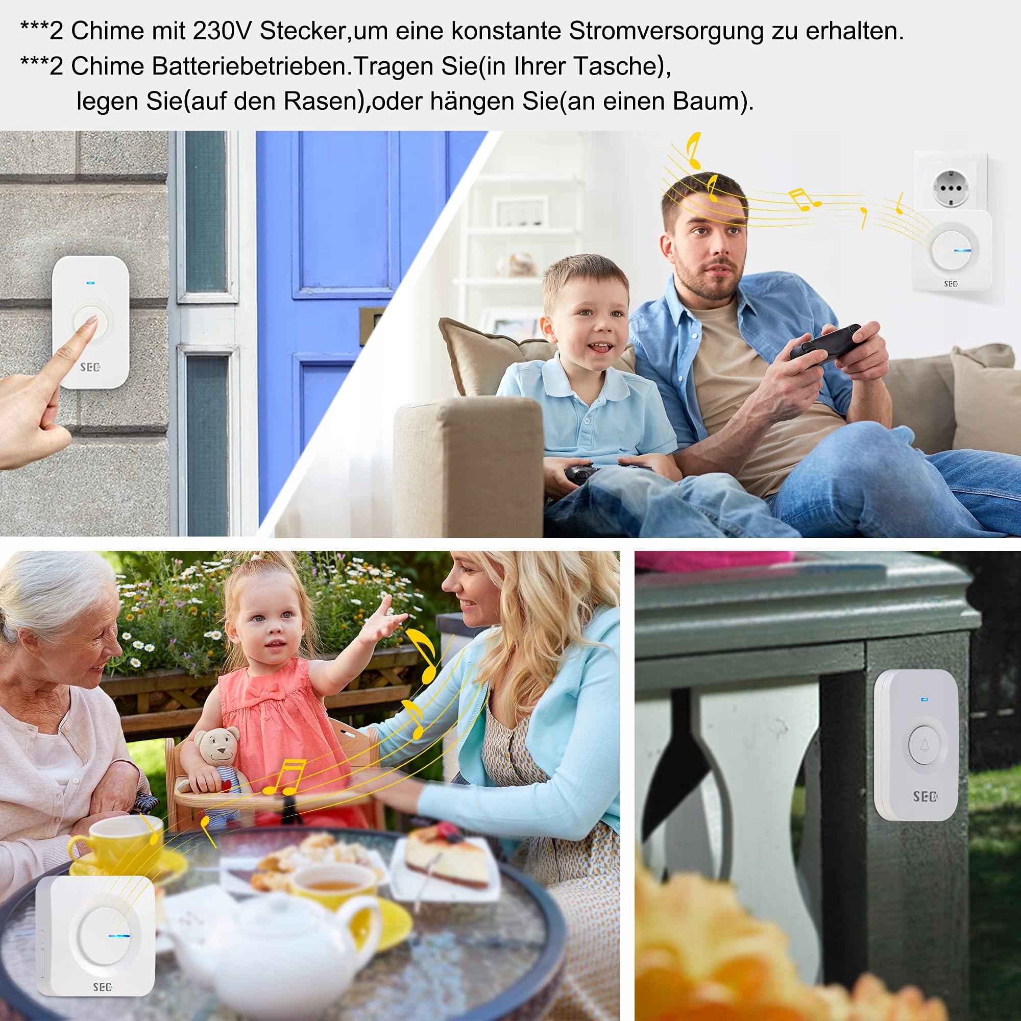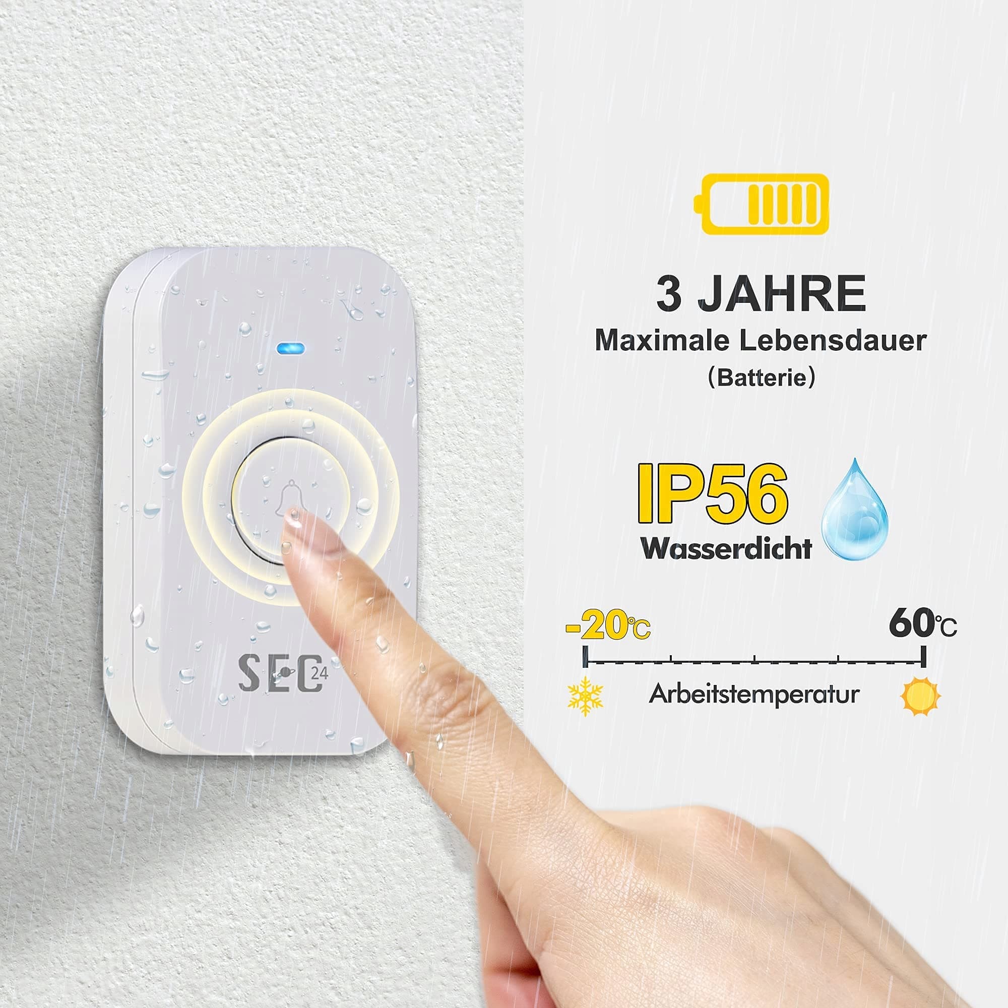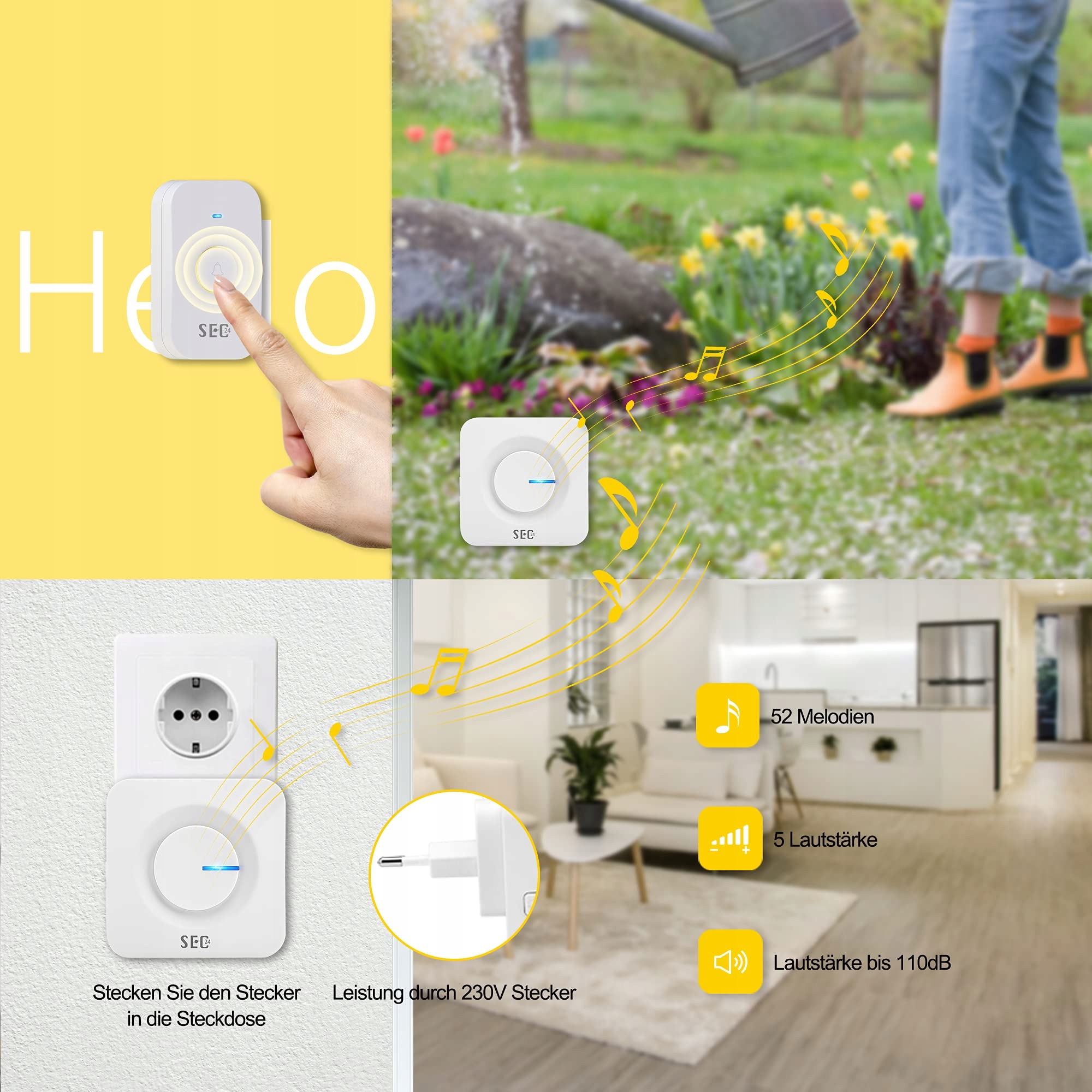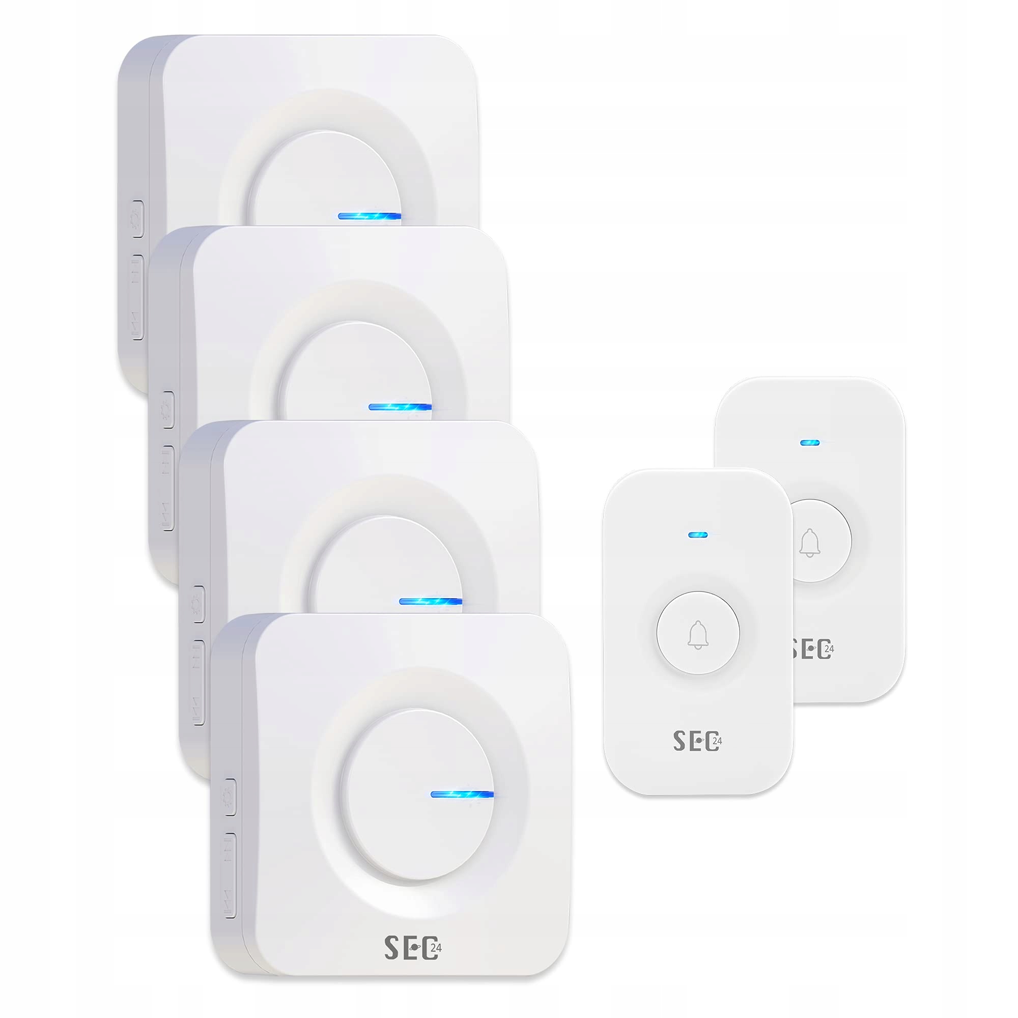 Dzwonek bezprzewodowy, zestaw dzwonków SEC24, zestaw dzwonków bezprzewodowych, 2 wodoodporne przyciski dzwonkowe do dzwonka do drzwi, 52 melodie, 5 poziomów głośności, 2 dzwonki do gniazdka, 2 dzwonki na baterie. Biały