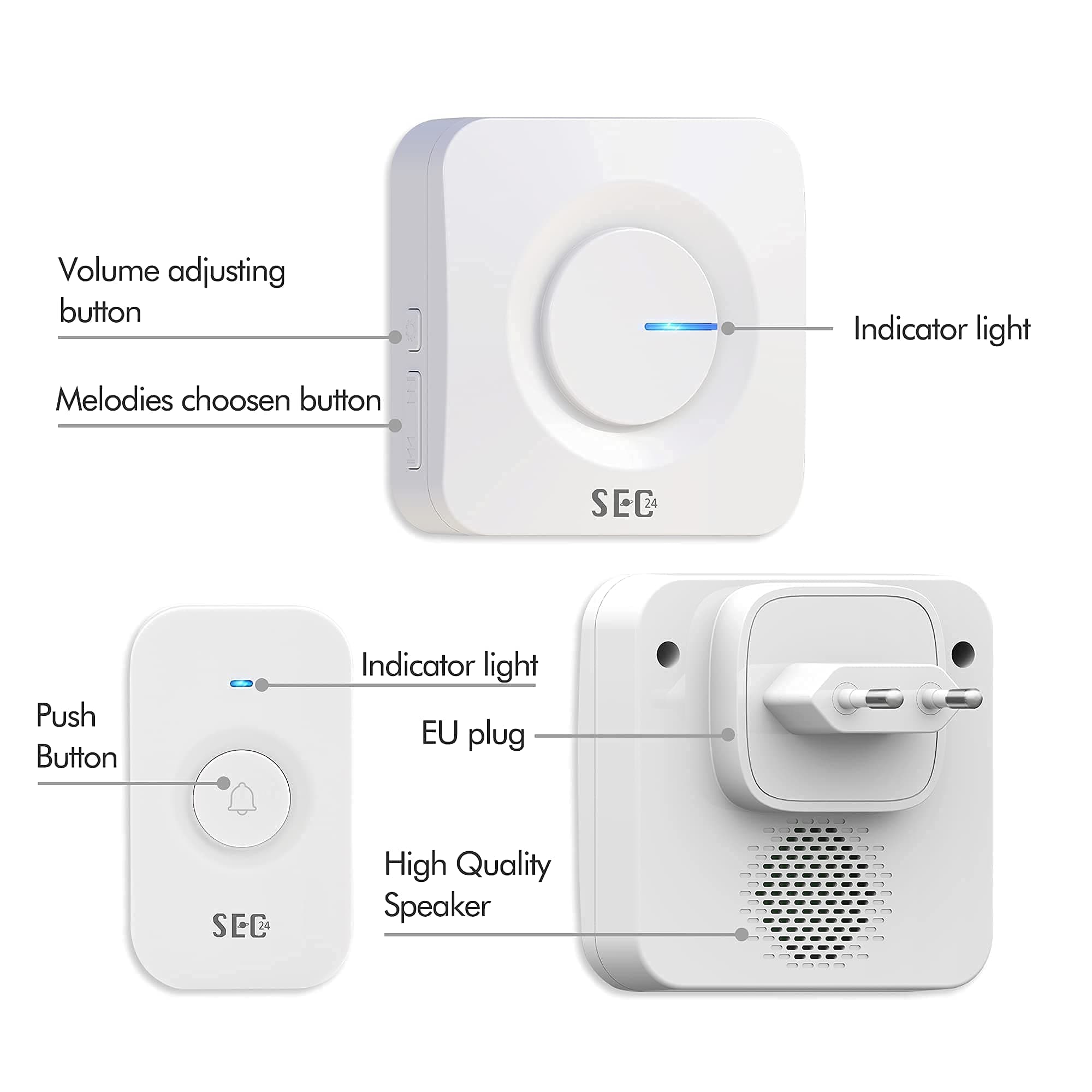 Dioda LED na dzwonku bezprzewodowym miga, gdy dzwonek dzwoni, idealne dla osób z problemami ze słuchem! Tryb wyciszenia 0 dB jest idealny dla osób, które chcą być niezakłócane. Zestaw dzwonków SEC24 jest całkowicie bezprzewodowy, więc bardzo łatwy w instalacji.