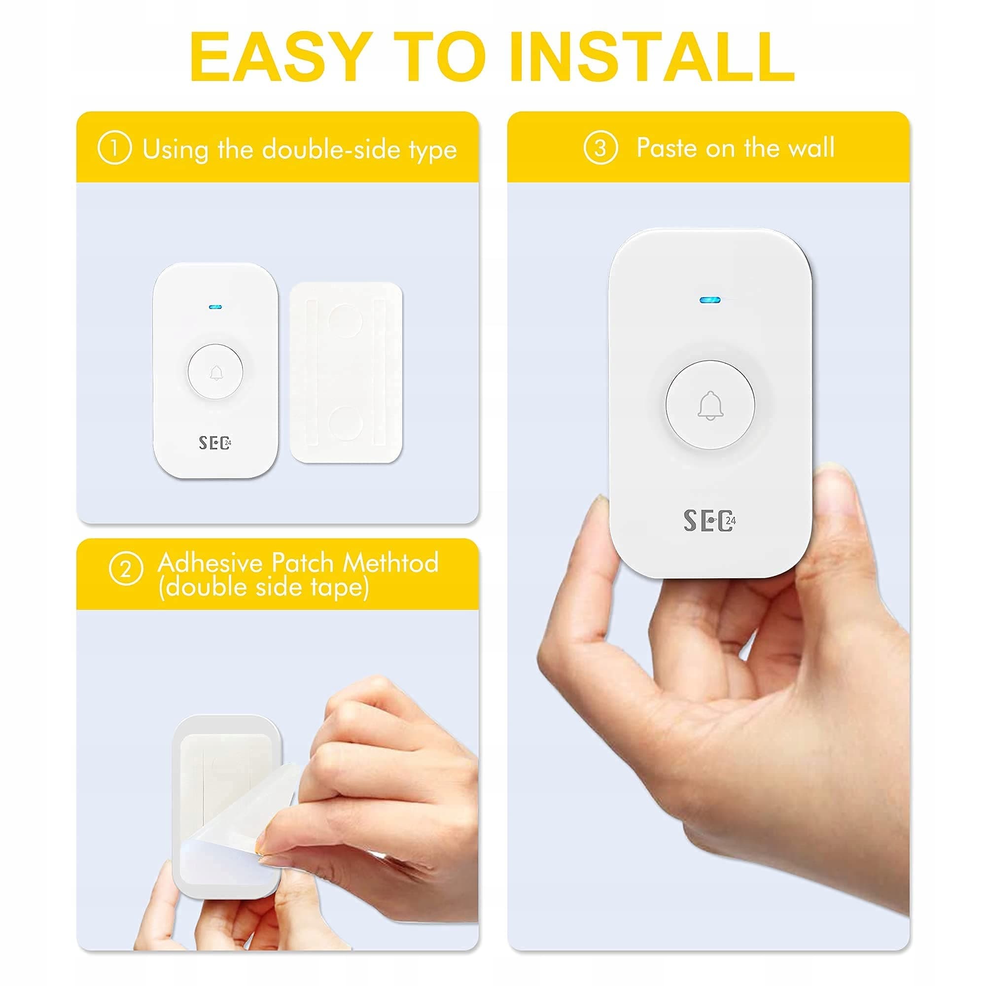 Ten zestaw dzwonków bezprzewodowych zawiera 2 wodoodporne przyciski dzwonkowe + 4 dzwonki bezprzewodowe. Przyciski dzwonkowe są wodoodporne i mogą być używane na zewnątrz. Użyj dołączonej taśmy dwustronnej (lub dołączonych śrub), aby przymocować przycisk dzwonkowy do bramy ogrodowej, bramy wejściowej, bramy tylnej itp.