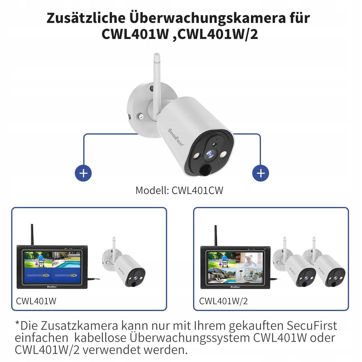 To jest dodatkowa kamera akcesoryjna do 7-calowego monitora dotykowego. Działa tylko z CWL401W, CWL401W/2, upewnij się, że masz monitor w ręku! Ekran z czterema widokami. Możliwość rozszerzenia do 4 kamer akcesoryjnych SecuFirst na ekranie.