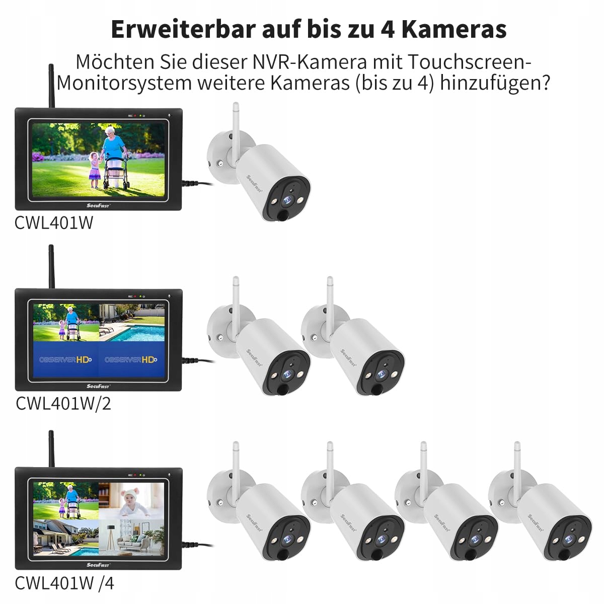 CWL401W, CWL401W/2 to prosty zestaw kamer monitoringu z monitorem dotykowym. Bez Internetu/Wi-Fi/telefonu/technicznej wiedzy możesz również korzystać z tego systemu NVR do monitoringu. Uwolnij swoje ręce, aby oglądać na żywo filmy z monitoringu na 7-calowym monitorze dotykowym. Mów i słuchaj, odtwarzaj nagrania na ekranie.