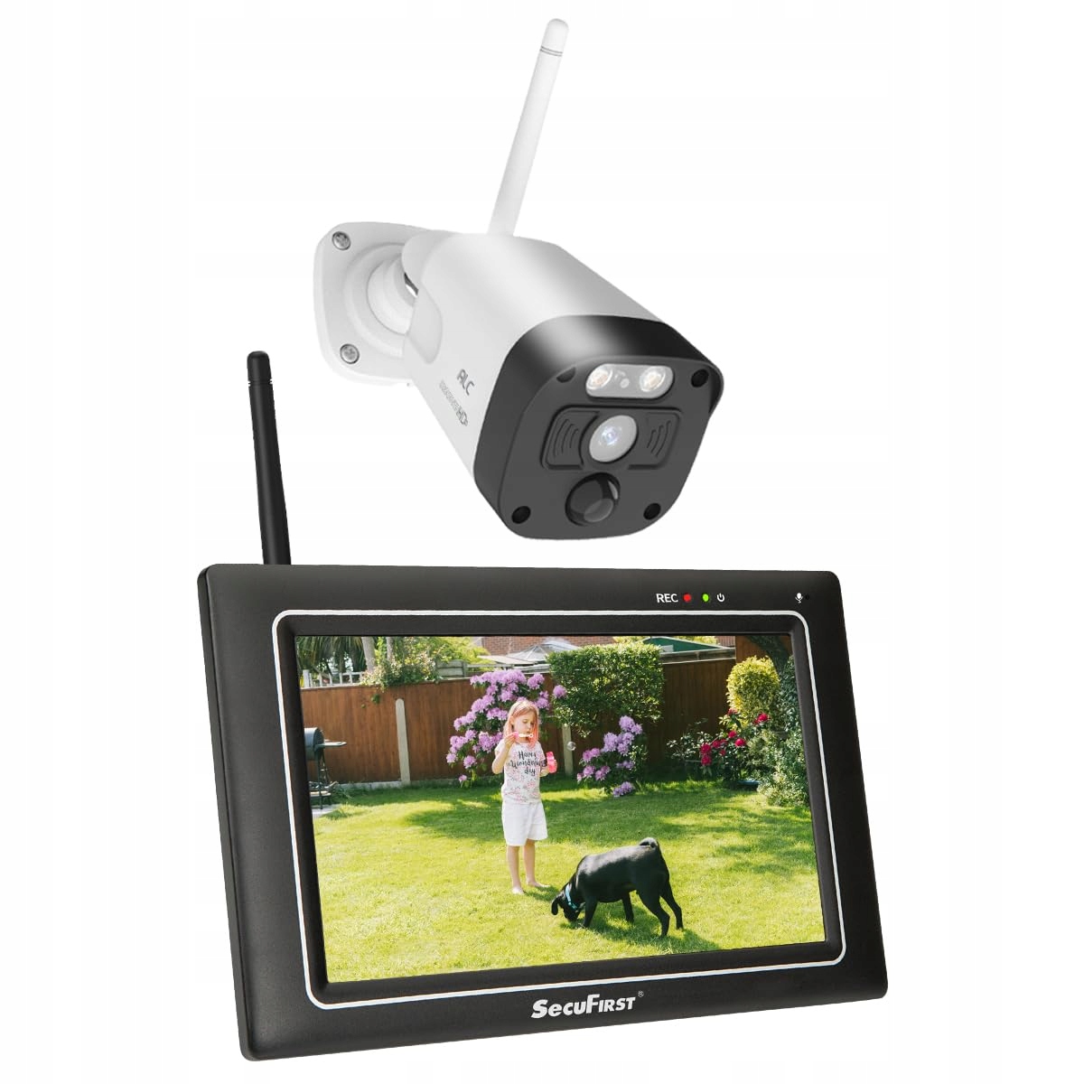 SecuFirst 2K Kamera monitorująca na zewnątrz z monitorem wewnętrznym, 7-calowy ekran dotykowy, babyphone z kamerą, praca na zewnątrz bez Wi-Fi, AI czujnik ruchu, 64 GB karta SD, interkom.
