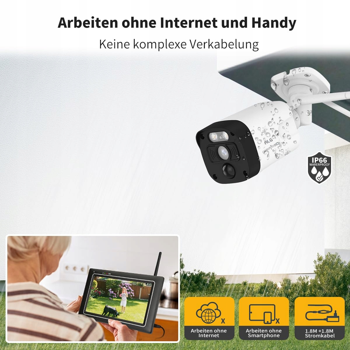Bez Internetu/Wi-Fi/telefonu komórkowego/technicznej wiedzy możesz również korzystać z tych bezprzewodowych zestawów DVR do monitoringu. Kamery do monitorowania wewnętrznego i zewnętrznego zostały już sparowane z monitorem, gdy są włączone, nawet jeśli nie ma Internetu, na żywo wideo można oglądać na monitorze po kilku sekundach. Zasięg kamery zewnętrznej do monitora wynosi do 300 metrów bez zakłóceń.