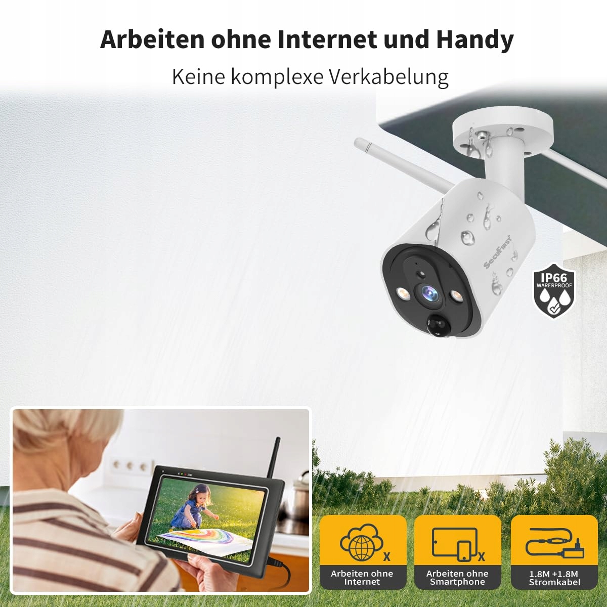 SECUFIRST Zestaw Kamer Zewnętrznych Z Monitorem 7" 2K Kamera 32GB Pamięci