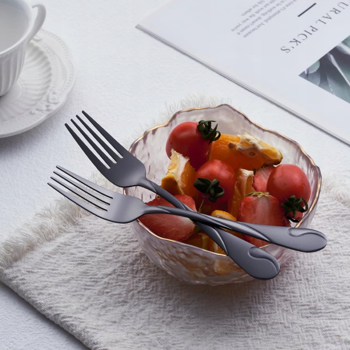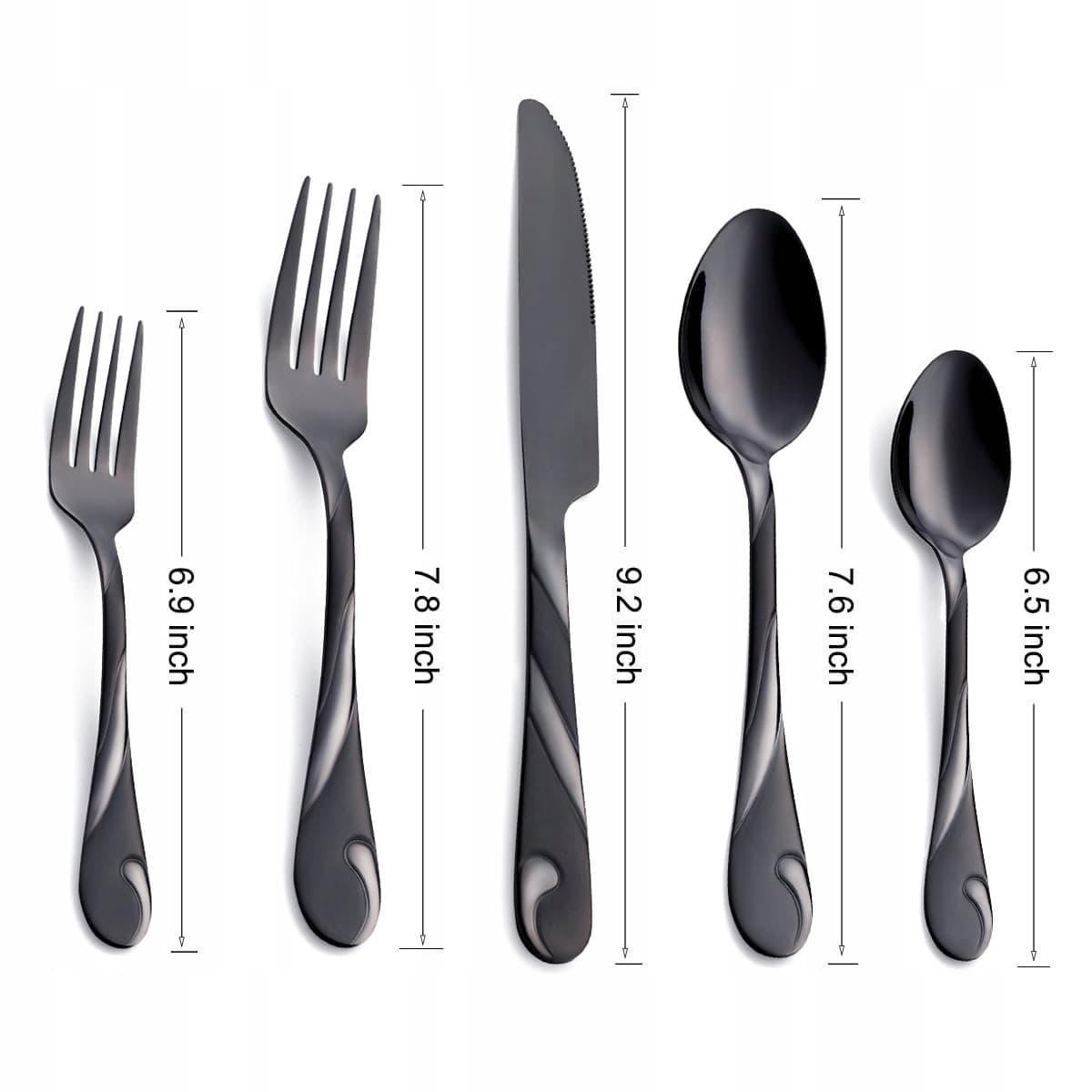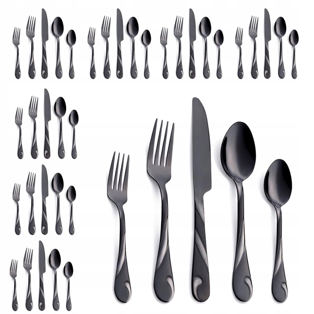 ZAWARTOŚĆ: Ten czarny zestaw sztućców zawiera 8 noży stołowych, 8 widelców stołowych, 8 łyżek stołowych, 8 widelczyków do sałatek/deserów oraz 8 łyżeczek do deserów/herbaty, idealnych do codziennego użytku lub przygotowania na kolację, imprezę i inne okazje.
