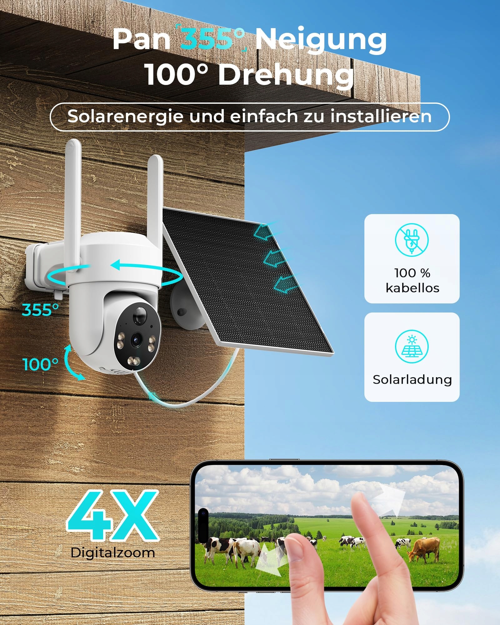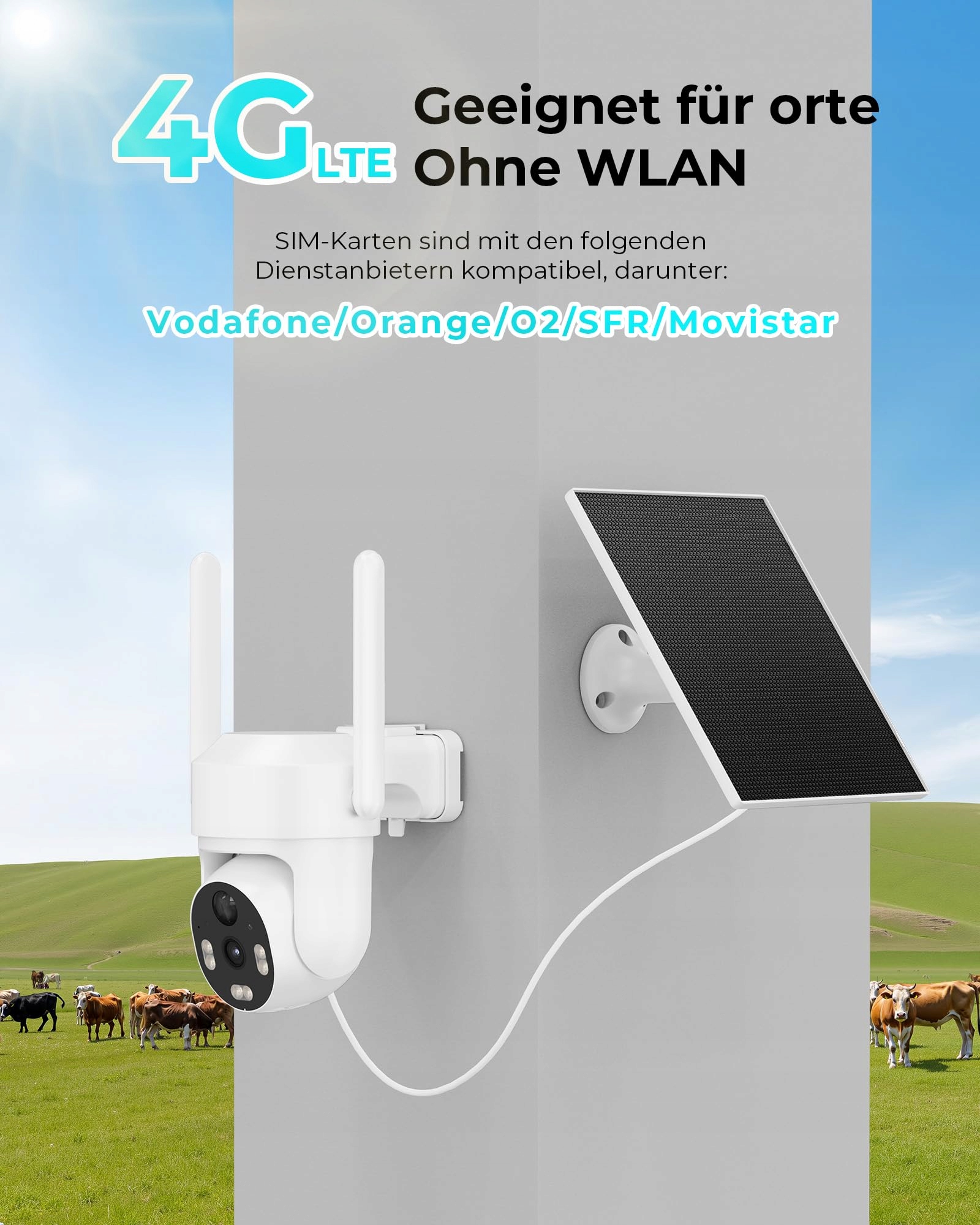【Nocna wizja 2K z szerokim kątem 355°】: Bezprzewodowa kamera solarna do monitoringu zewnętrznego zapewnia dzięki funkcji nocnej wizji wyraźny obraz w ciemności. Kamera z kartą SIM rejestruje każdy moment w rozdzielczości 2K dla lepszych szczegółów wizualnych. Z poziomym kątem obrotu 355° i pionowym 100° obsługuje również 4-krotny zoom cyfrowy, aby pokryć obszar PTZ i monitorować Twoją posesję bez martwych stref