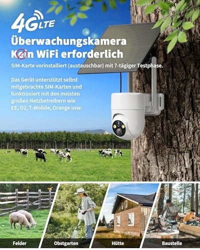 Kamera monitoringu 4G z kartą SIM: Kamera monitoringu SEHMUA z kartą SIM działa w sieci 3G/4G, dzięki czemu jest idealna do miejsc bez Wi-Fi, takich jak gospodarstwa rolne, plantacje owoców i place budowy. Kamera monitoringu 4G jest zasilana panelem solarnym, co eliminuje potrzebę zewnętrznego źródła zasilania i ułatwia instalację oraz użytkowanie. Uwaga: Ta kamera 4G LTE od SEHMUA nie oferuje funkcji Wi-Fi.