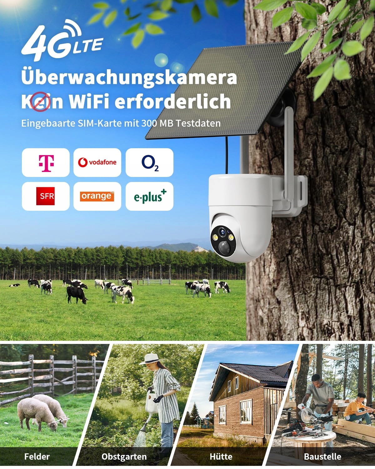 Kamera monitorująca 4G z kartą SIM: Kamera monitorująca SEHMUA z kartą SIM działa w sieci 3G/4G, co czyni ją idealną do miejsc bez zasięgu Wi-Fi, takich jak farmy, sady owocowe i place budowy. Kamera monitorująca 4G jest zasilana przez panel solarny, dzięki czemu nie wymaga zewnętrznego źródła zasilania, co ułatwia instalację i użytkowanie. Uwaga: Ta kamera 4G LTE marki SEHMUA nie obsługuje połączenia Wi-Fi.