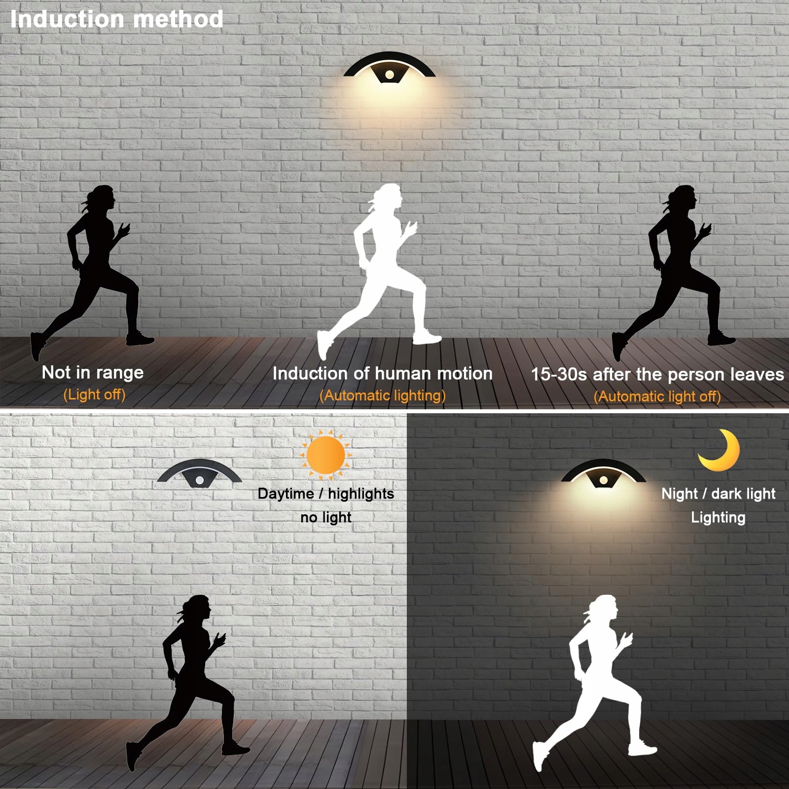 Inteligentny czujnik: Kinkiet zewnętrzny wyposażony w czujnik podczerwieni, zasięg wykrywania 5 metrów, kąt czujnika 120° szerokokątny; wykrywa ruch człowieka i automatycznie włącza lub wyłącza światło; wbudowane elementy światłoczułe, które uruchamiają lampę tylko wtedy, gdy jest za mało światła w otoczeniu, co pozwala na oszczędzanie energii w ciągu dnia; brak potrzeby ręcznego włączania i wyłączania światła