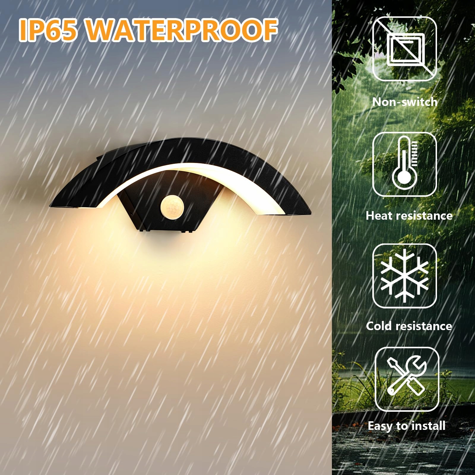 Wodoodporność IP65: Czarny kinkiet z czujnikiem wykonany jest w całości w technologii odlewu ciśnieniowego, co zapewnia brak szczelin, odporność na wilgoć i utlenianie; zakrzywiony kształt górnej części korpusu skutecznie odprowadza wodę deszczową; łatwo radzi sobie z silnym mrozem i upałem. Idealny do oświetlenia ogrodów, korytarzy, garaży, balkonów, willi, podjazdów, schodów, tarasów, ogrodzeń, bram, oświetlenia wejść oraz innych zastosowań wewnętrznych i zewnętrznych