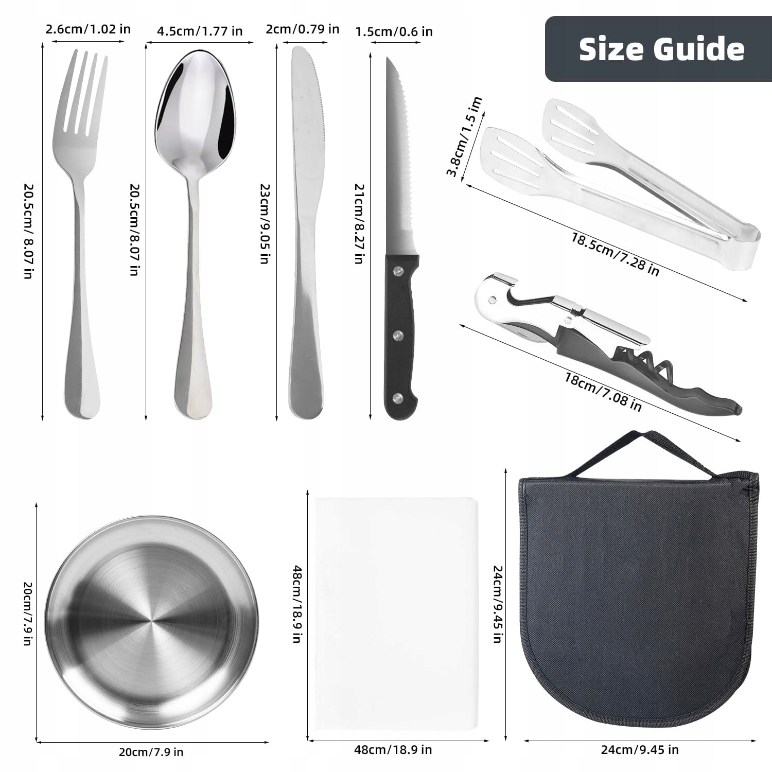 Zestaw sztućców kempingowych: 2 zestawy sztućców kempingowych zawierające 2 widelce, 2 łyżki, 2 noże, 1 otwieracz do butelek, 1 nóż do masła, 2 serwetki, 1 klips do żywności, 2 talerze + 1 torba do przechowywania