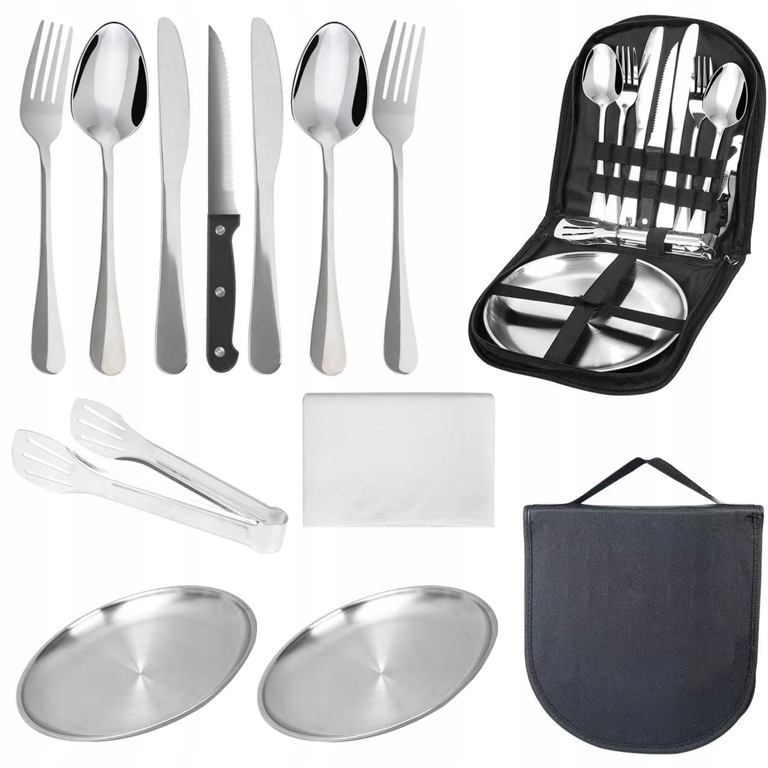 13-częściowy zestaw sztućców kempingowych dla 2 osób, zestaw piknikowy, stalowe widelce, talerze, noże i łyżki, w tym przenośna torba na sztućce, wielokrotnego użytku, trwałe