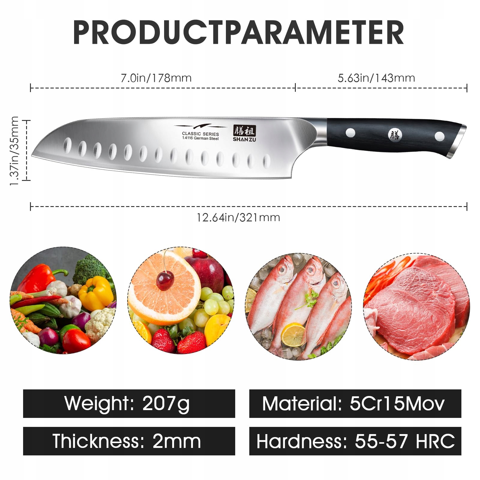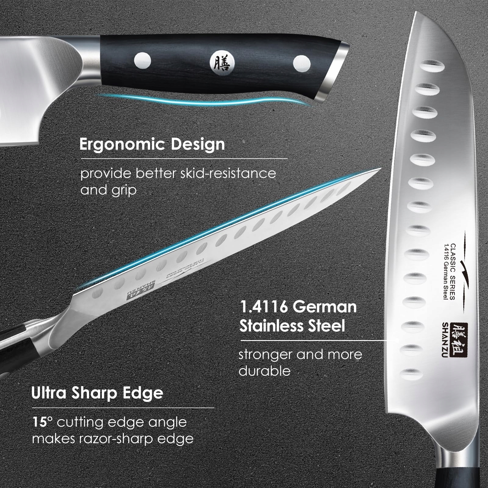 [Klinga z węglowej niemieckiej stali nierdzewnej]: Nóż kuchenny santoku wykonany jest z niemieckiej stali węglowej i ma twardość 54-57 HRC (test twardości Rockwella), co czyni go najtrwalszym narzędziem w tej kategorii. Nóż kuchenny charakteryzuje się wysoką twardością, odpornością na zużycie, trwałością, odpornością na rdzewienie i korozję oraz właściwościami antyfoulingowymi, co zapewnia zdrowe życie w kuchni.