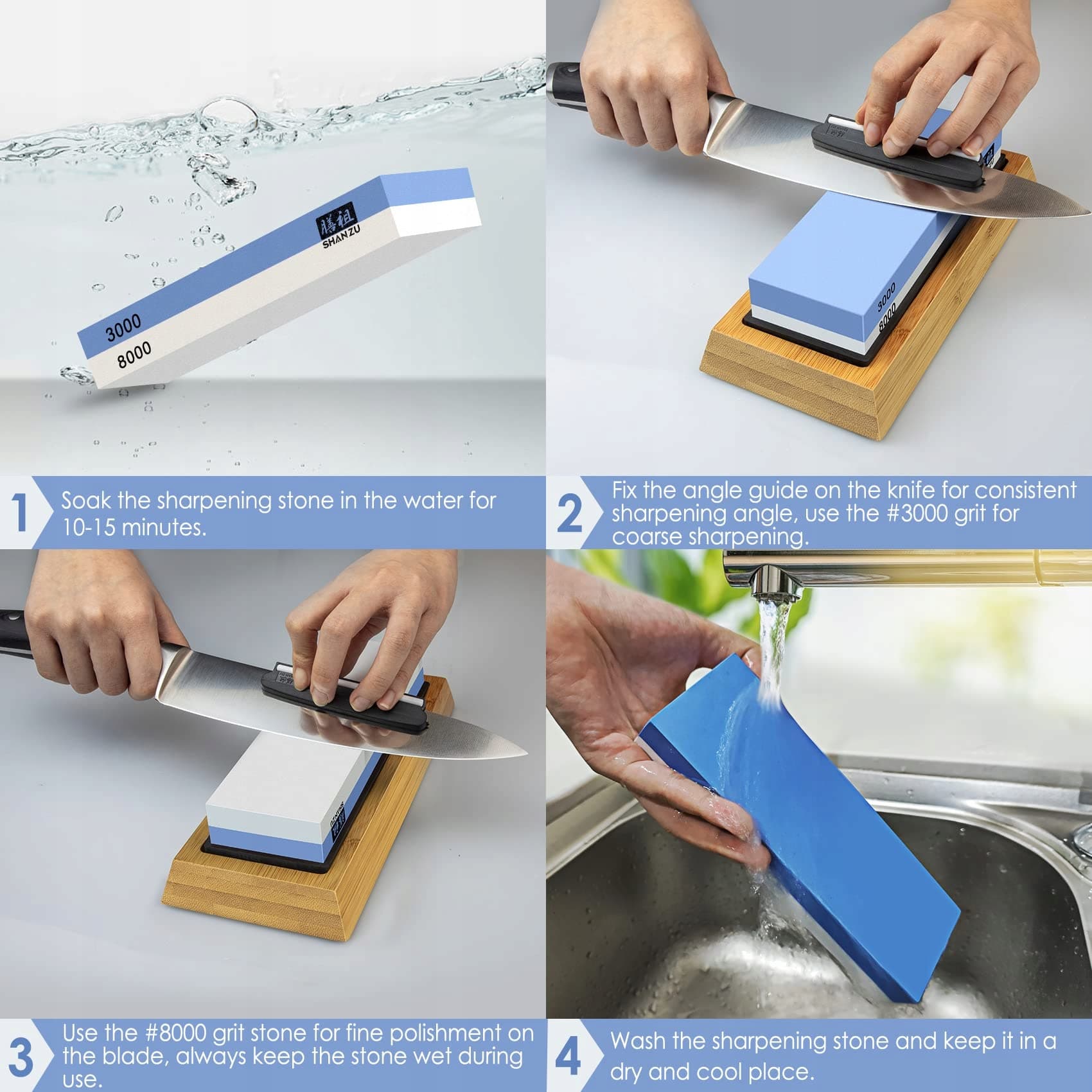 SHAN ZU Kamień szlifierski Kamień do ostrzenia Wetzstein dla profesjonalistów 2-w-1 Dwustronny ostrzałka do noży, ziarnistość 3000/8000 z antypoślizgowym silikonowym uchwytem do noży kuchennych