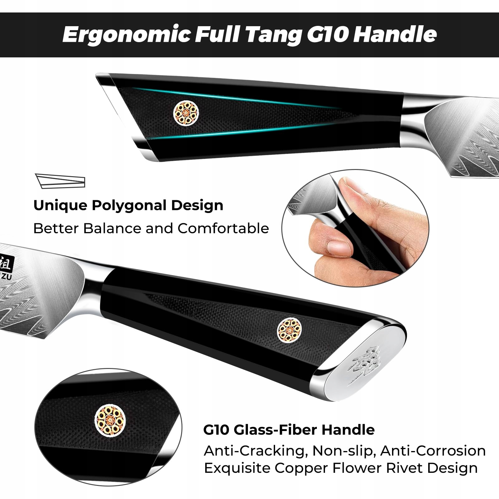 【Ergonomiczny uchwyt G10】 Ergonomiczny uchwyt zapewnia idealny chwyt, aby zapewnić równowagę z nożem kuchennym, jest odporny na zimno i nie deformuje się. Podwójne ostrze jest bardziej praktyczne dla prawej i lewej ręki! Sprawia, że nasze noże kuchenne są bardziej profesjonalne i zmniejsza zmęczenie lub drętwienie rąk po dłuższym krojeniu. Doskonała kontrola uchwytu, antypoślizgowy, komfortowy i trwały.