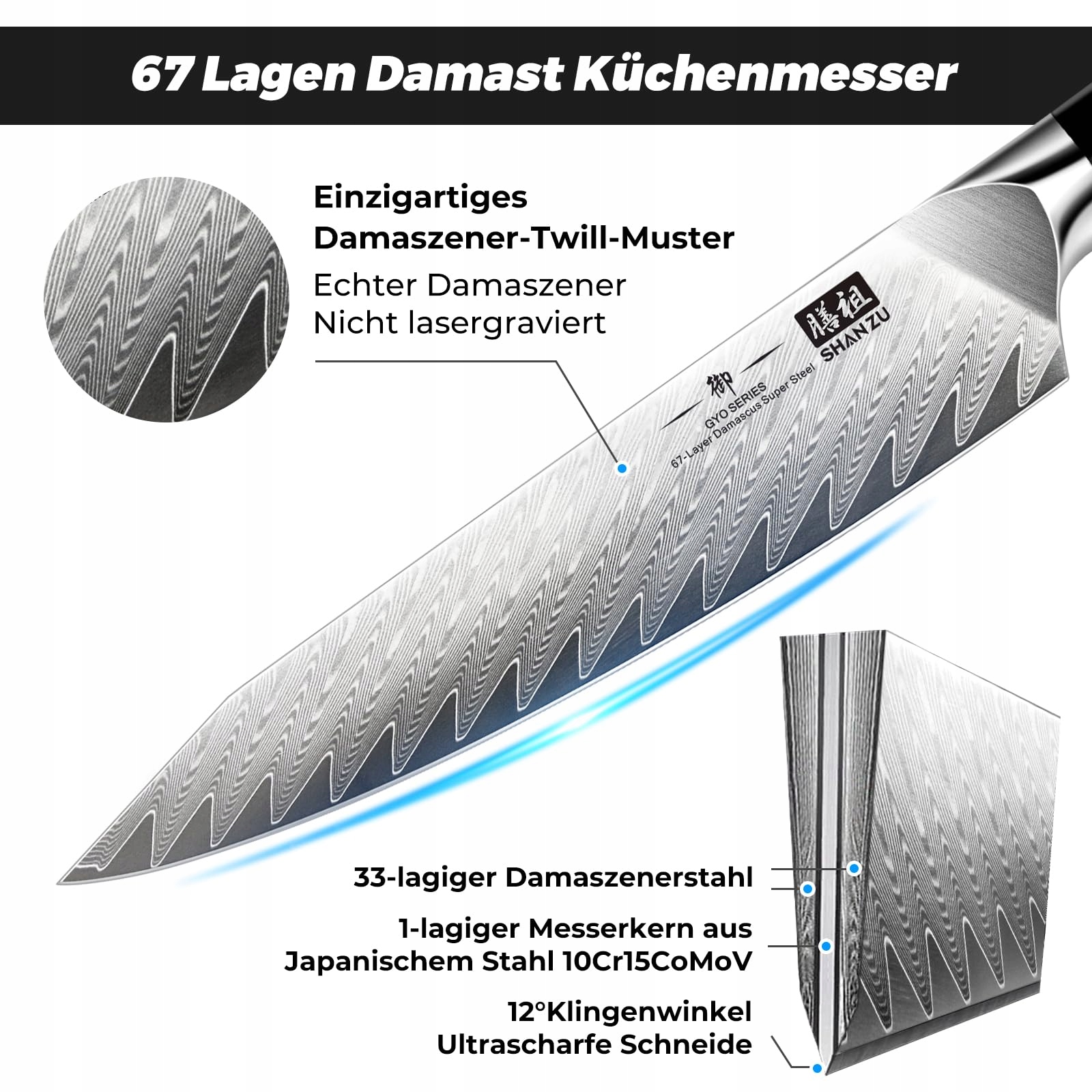 【Prawdziwy nóż damasceński, trwały i piękny: Japoński nóż damasceński znany jest z pięknych wzorów. Proces tworzenia wzoru damasceńskiego SHAN ZU polega na układaniu arkuszy stali węglowej, wielokrotnym składaniu i przegrzewaniu, aż powstanie wzór ostrza. Wzór staje się wyraźniejszy po polerowaniu, co ma silną atrakcyjność wizualną