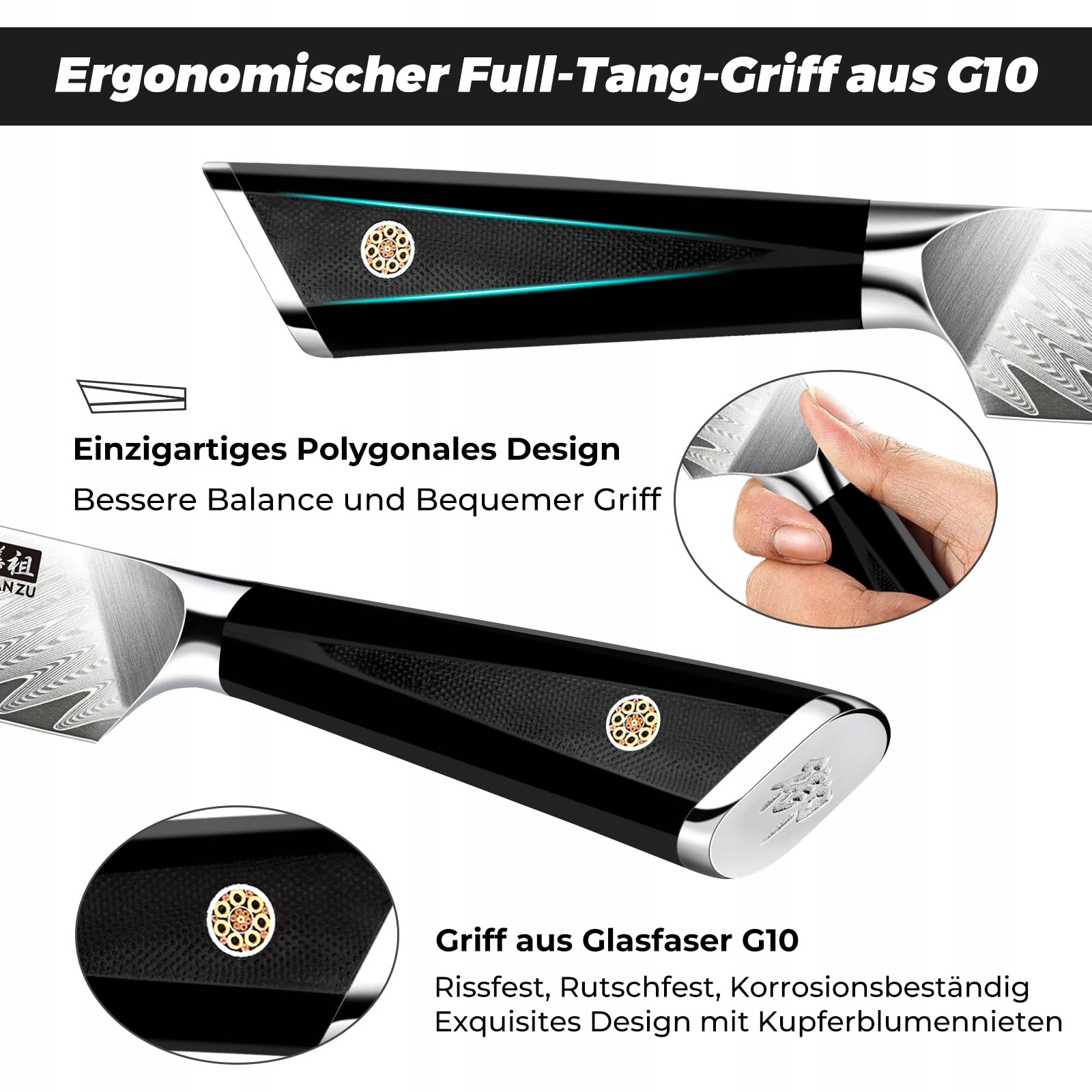 【Uchwyt z włókna szklanego G10, wygodny uchwyt: Poligonalny uchwyt sprawia, że nasz nóż jest wygodniejszy i piękniejszy. Materiał G10 i konstrukcja z pełnym trzpieniem sprawiają, że nasz uchwyt jest stabilny i nieodkształcalny. Ergonomiczny uchwyt zapewnia idealny chwyt, aby zapewnić równowagę z nożem kuchennym