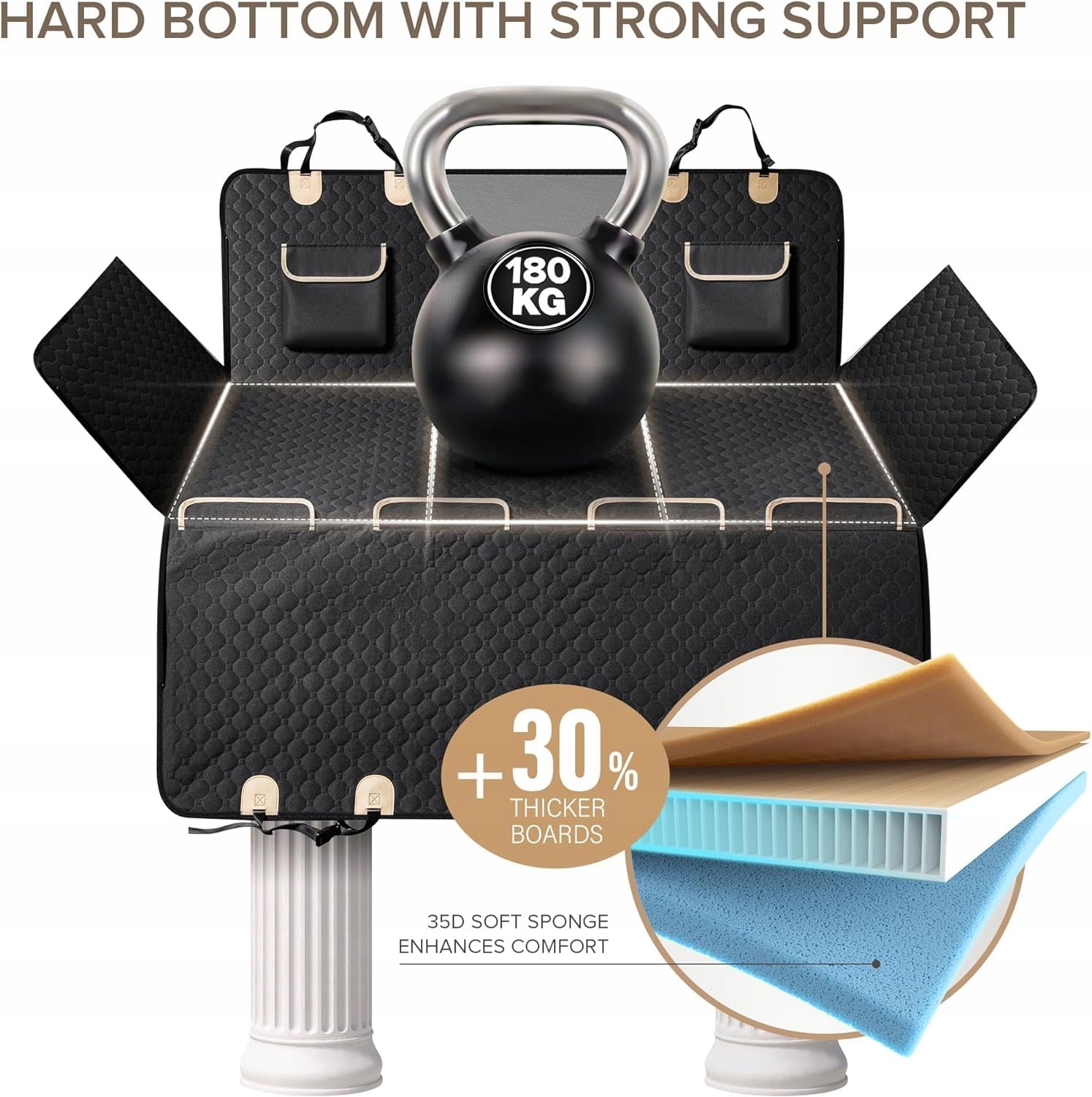 Twarda dolna osłona siedzenia samochodowego dla psa zapewnia 99,9% wykorzystania przestrzeni – twarde dno tworzy prawie 40% dodatkowej płaskiej przestrzeni, aby poprawić obszar tylnego siedzenia Twojego pickupa. Hamak dla psa do ciężarówki posiada trzy dodatkowo wytrzymałe deski, dzięki czemu pies może swobodnie poruszać się podczas jazdy i wygodnie rozciągać się we wszystkich tylnych przestrzeniach. Dzięki czterem bocznym klapom, które służą jako ochrona, Twoje zwierzę może pozostać bezpieczne w przypadku nagłego zatrzymania, co zapewnia bezstresową podróż dla Ciebie i Twoich futrzanych przyjaciół