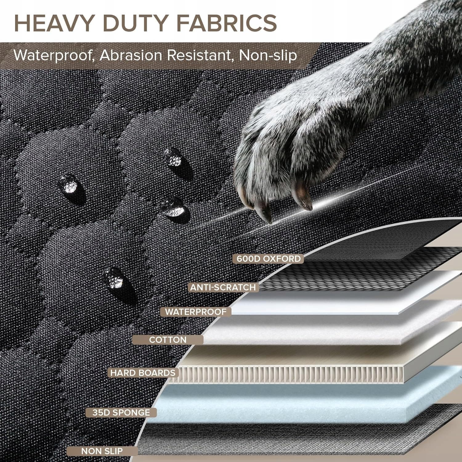 7-warstwowe materiały dla silnego wsparcia, ochrony i komfortu: Wykonane z trwałych materiałów, w tym odpornego na zarysowania 600D Oxford, wodoodpornej tkaniny, pogrubionych twardych płyt dolnych, miękkiej pianki 35D i warstw bawełny dla dodatkowego komfortu oraz antypoślizgowej tkaniny, która nie przesuwa się. Osłona siedzenia dla zwierząt domowych chroni ciężarówki przed zużyciem, wodą i plamami. Dodatkowa wysoka ochrona drzwi zapobiega zadrapaniom, dzięki czemu psy mogą radośnie wchodzić i wychodzić, a Ty masz idealnie zachowane wnętrze